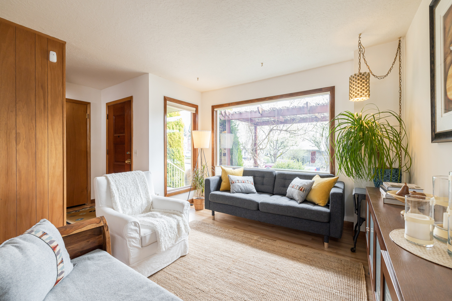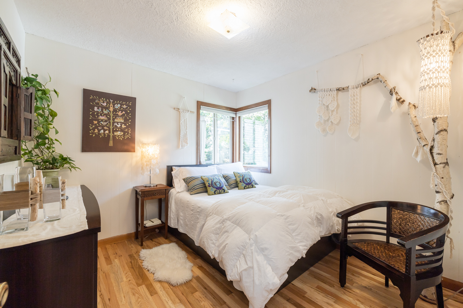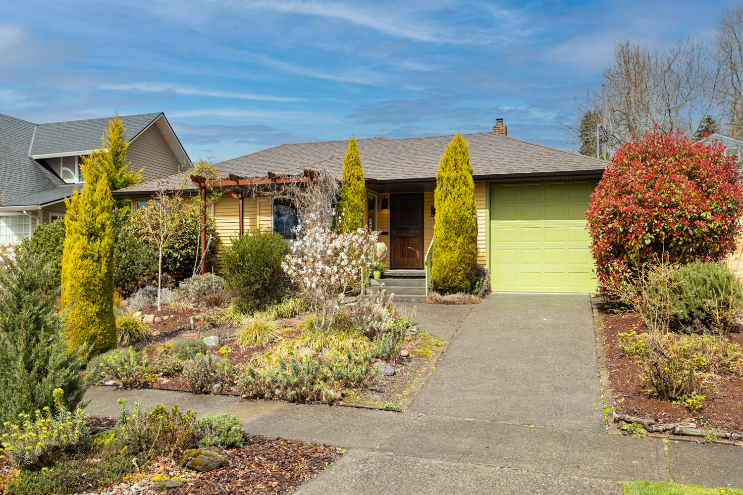 Immaculate mid-century home in sought after Eastmoreland Heights neighborhood with income producing guest house! This pristine south facing home sits elevated above the quiet neighborhood street, offering privacy and lots of natural light. With three separate gardens, this is truly an outdoor oasis including low water use beautiful flowering shrubs, trees, woodland natives and flowers inviting many birds, bees and butterflies to enjoy through the large picture windows! Multiple outdoor eating & living areas including 15′ x 13′ covered cedar back deck for the main house, plus a covered private patio for the guest house invite to entertain or have al fresco dinners from spring to fall. Seller is a designer who meticulously updated the home with quality products, but kept much of the original 1950s charm. Enjoy the gleaming hardwood floors with mahogany trim, a lovingly restored maple kitchen with original hardware or take a Finnish Sauna and step outside onto the private deck to cool off and watch the sunset. Updates include: partially finished basement with egress windows, bedroom & bathroom with sauna. The darling guest house includes a loft, bath and kitchenette, as well as a covered patio and private backyard, separate from the main house garden. The guest house has its own private access, although being attached to the main house. All work has been permitted with the City of Portland. The guest house rents for $1200 per month through Furnished Finder and $65 – $85 per night through Airbnb. Links to listings are available upon request. This is a coveted quiet location, yet it is near popular Woodstock amenities such as eateries, coffee shops, grocery stores, parks, and bike trails! Garden house furnishings included with the sale. Furnished Finder or Airbnb listing can be transferred to new owner upon request. Established 5 star review rating.