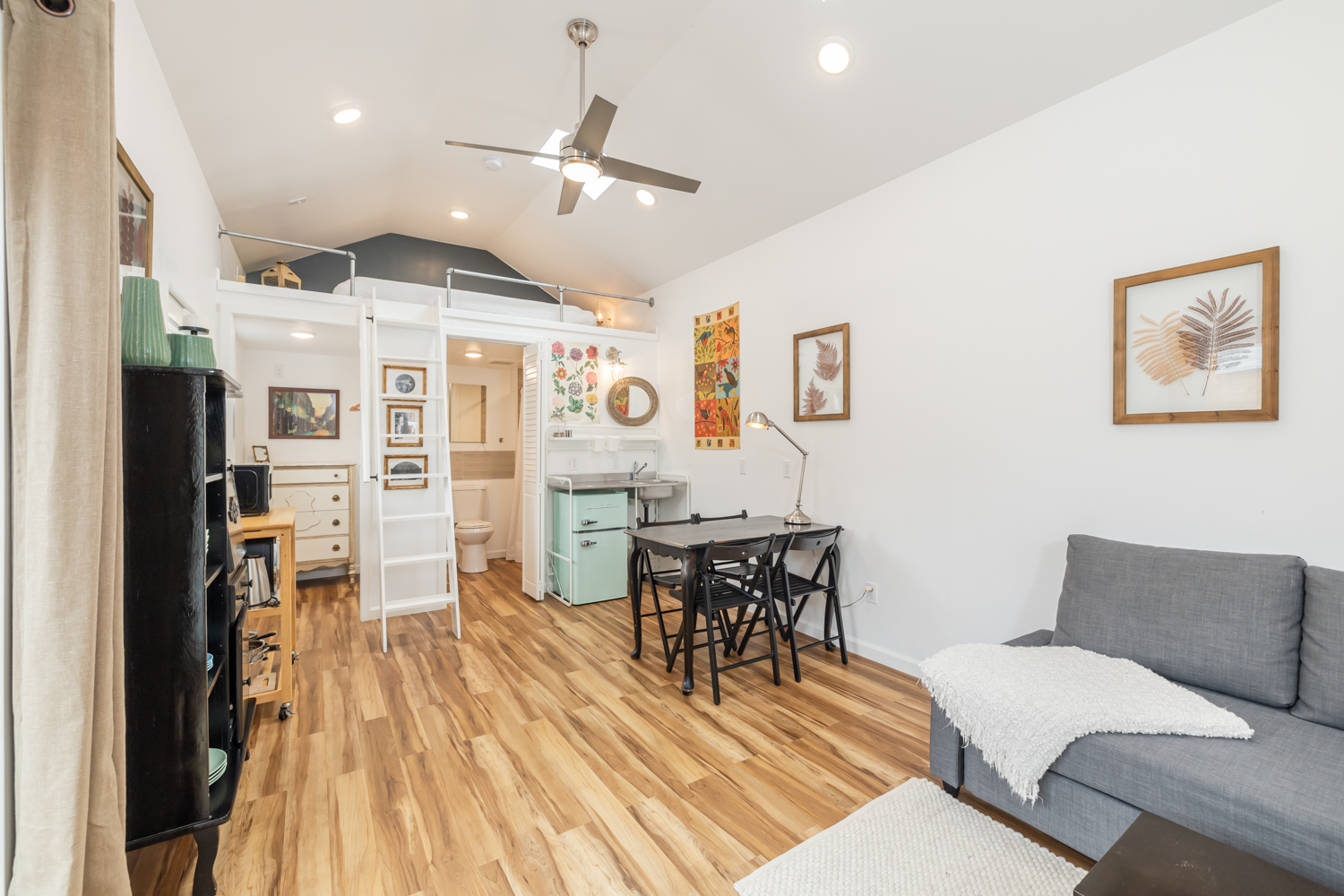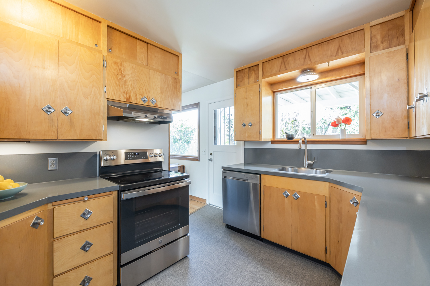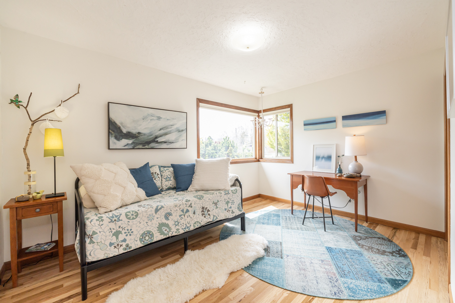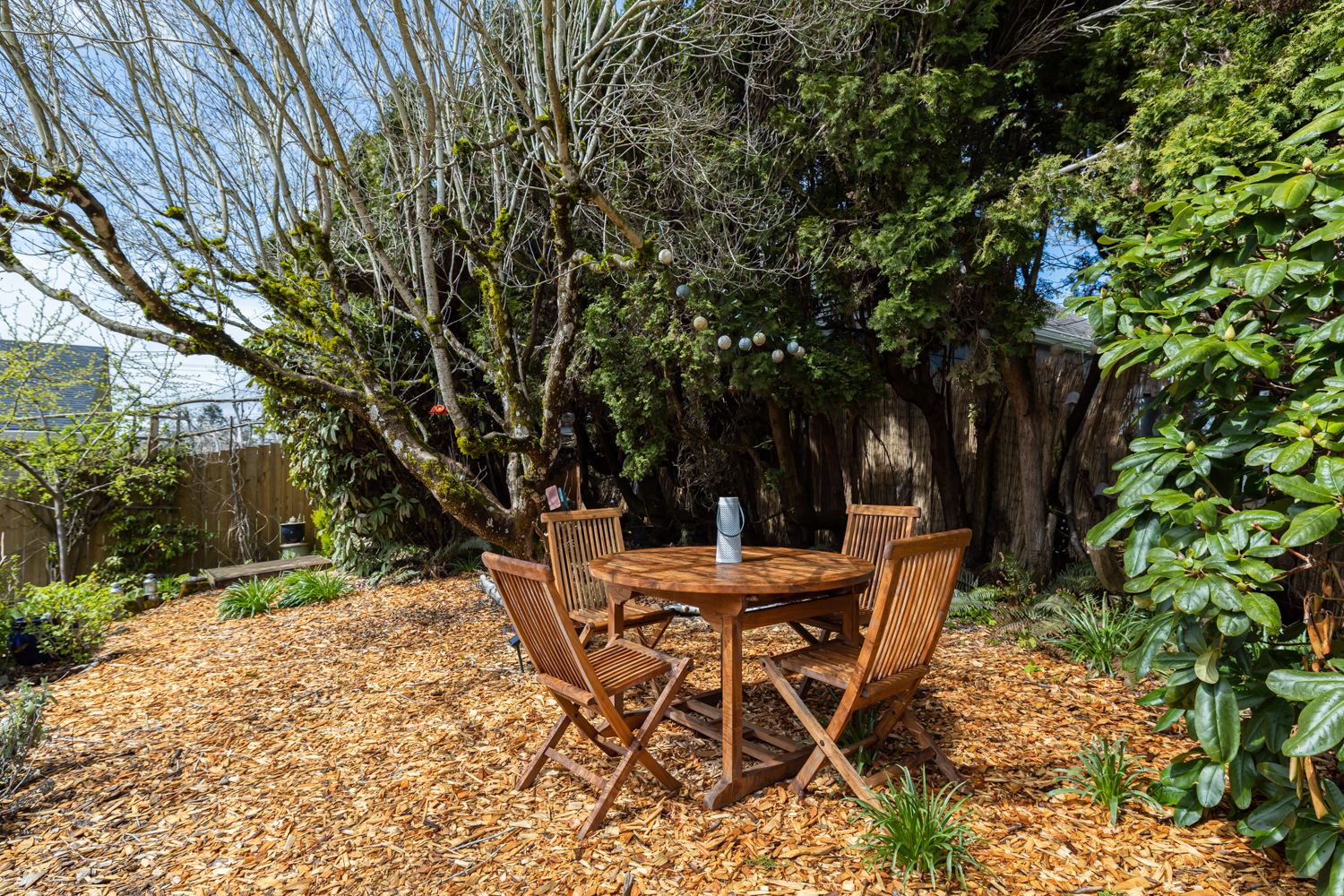 Immaculate mid-century home in sought after Eastmoreland Heights neighborhood with income producing guest house! This pristine south facing home sits elevated above the quiet neighborhood street, offering privacy and lots of natural light. With three separate gardens, this is truly an outdoor oasis including low water use beautiful flowering shrubs, trees, woodland natives and flowers inviting many birds, bees and butterflies to enjoy through the large picture windows! Multiple outdoor eating & living areas including 15′ x 13′ covered cedar back deck for the main house, plus a covered private patio for the guest house invite to entertain or have al fresco dinners from spring to fall. Seller is a designer who meticulously updated the home with quality products, but kept much of the original 1950s charm. Enjoy the gleaming hardwood floors with mahogany trim, a lovingly restored maple kitchen with original hardware or take a Finnish Sauna and step outside onto the private deck to cool off and watch the sunset. Updates include: partially finished basement with egress windows, bedroom & bathroom with sauna. The darling guest house includes a loft, bath and kitchenette, as well as a covered patio and private backyard, separate from the main house garden. The guest house has its own private access, although being attached to the main house. All work has been permitted with the City of Portland. The guest house rents for $1200 per month through Furnished Finder and $65 – $85 per night through Airbnb. Links to listings are available upon request. This is a coveted quiet location, yet it is near popular Woodstock amenities such as eateries, coffee shops, grocery stores, parks, and bike trails! Garden house furnishings included with the sale. Furnished Finder or Airbnb listing can be transferred to new owner upon request. Established 5 star review rating.
