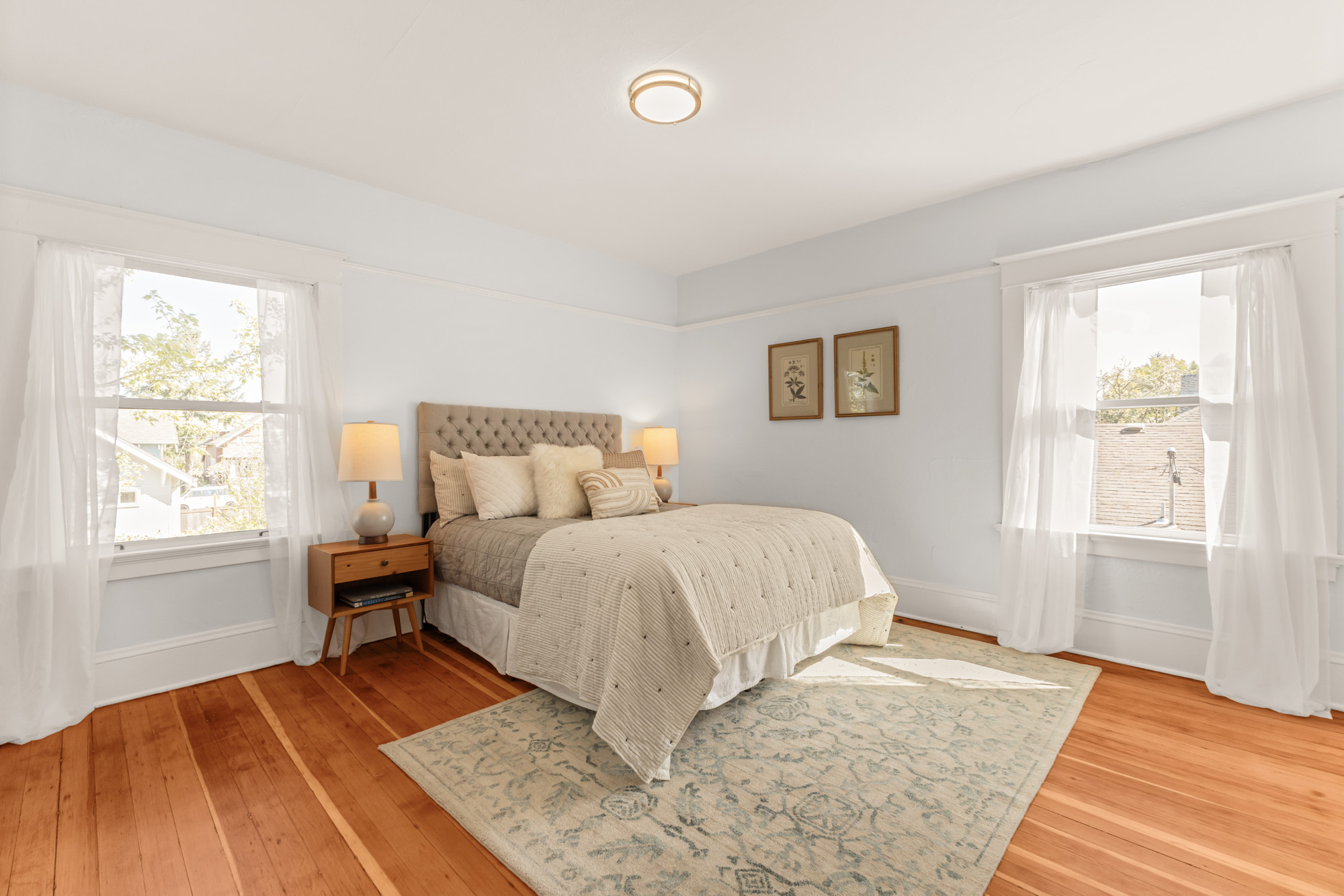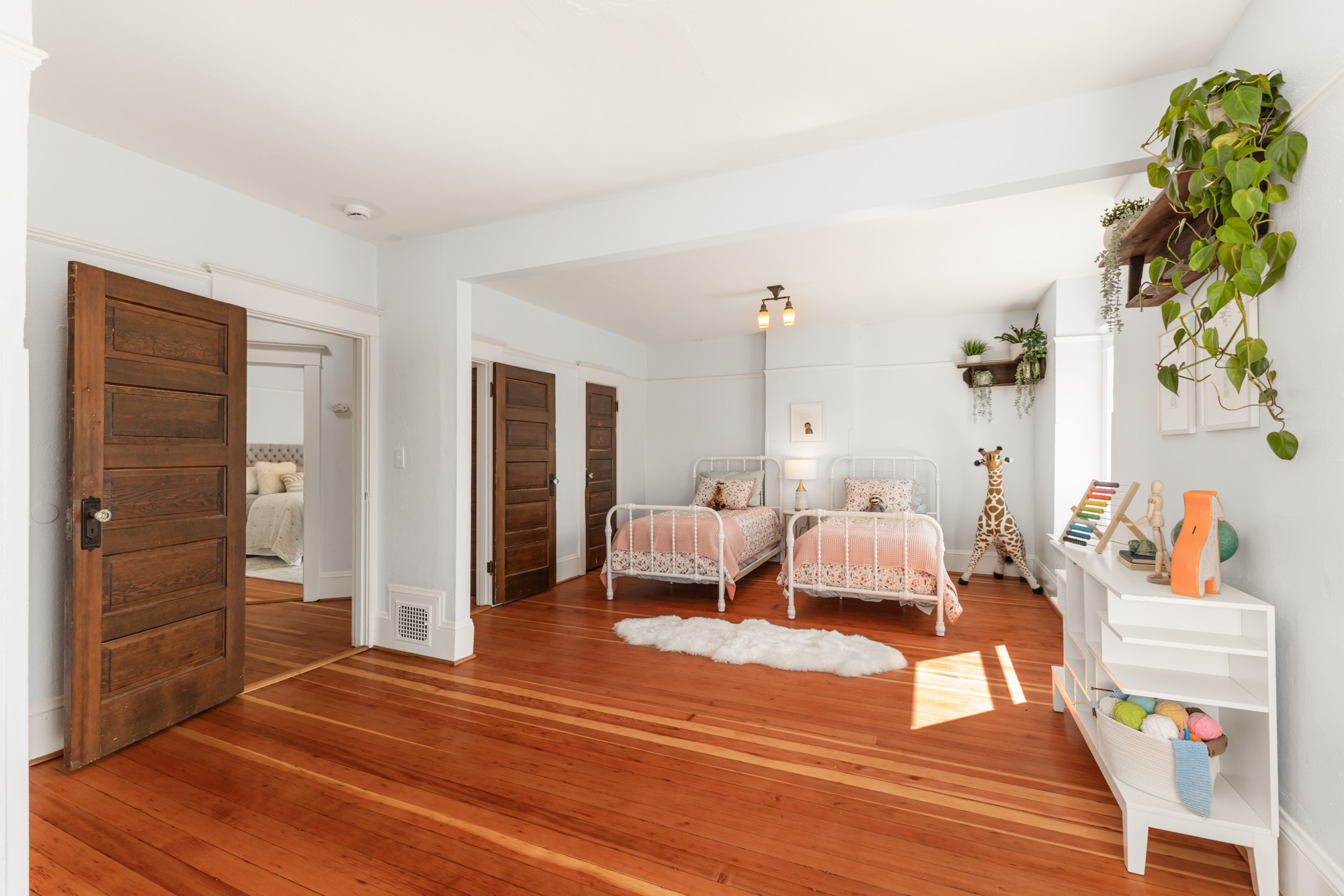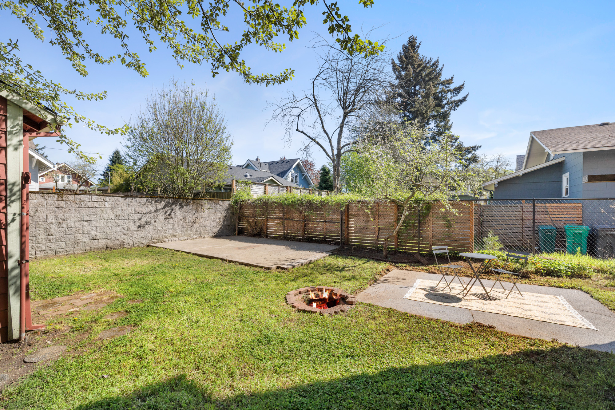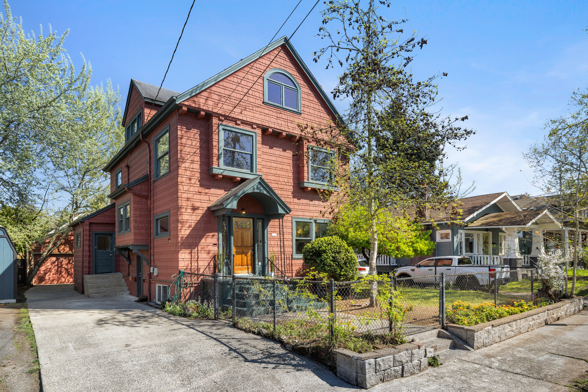 Six bedrooms across three floors with plenty of storage. Primary suite and second bedroom share a full bath. Third floor has three additional bedrooms. Partially finished basement with rec room, bedroom, full bath, and storage. Landscaped, gated yard with patio areas, in-ground fire pit, and newer detached two-car garage. Blocks from some of Portland’s most talked-about shops, restaurants, and cafes.