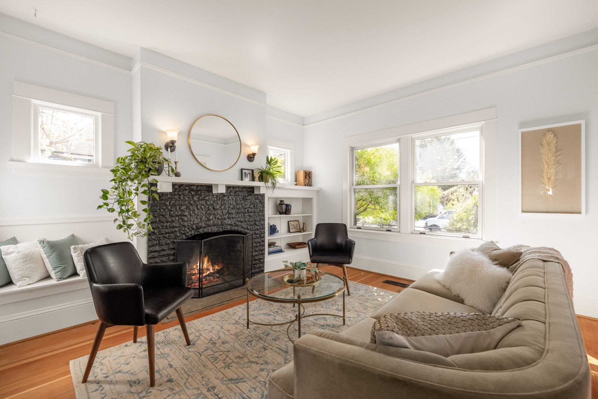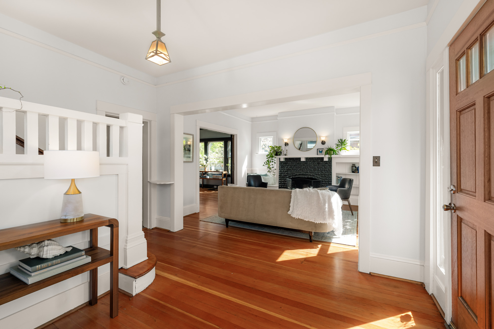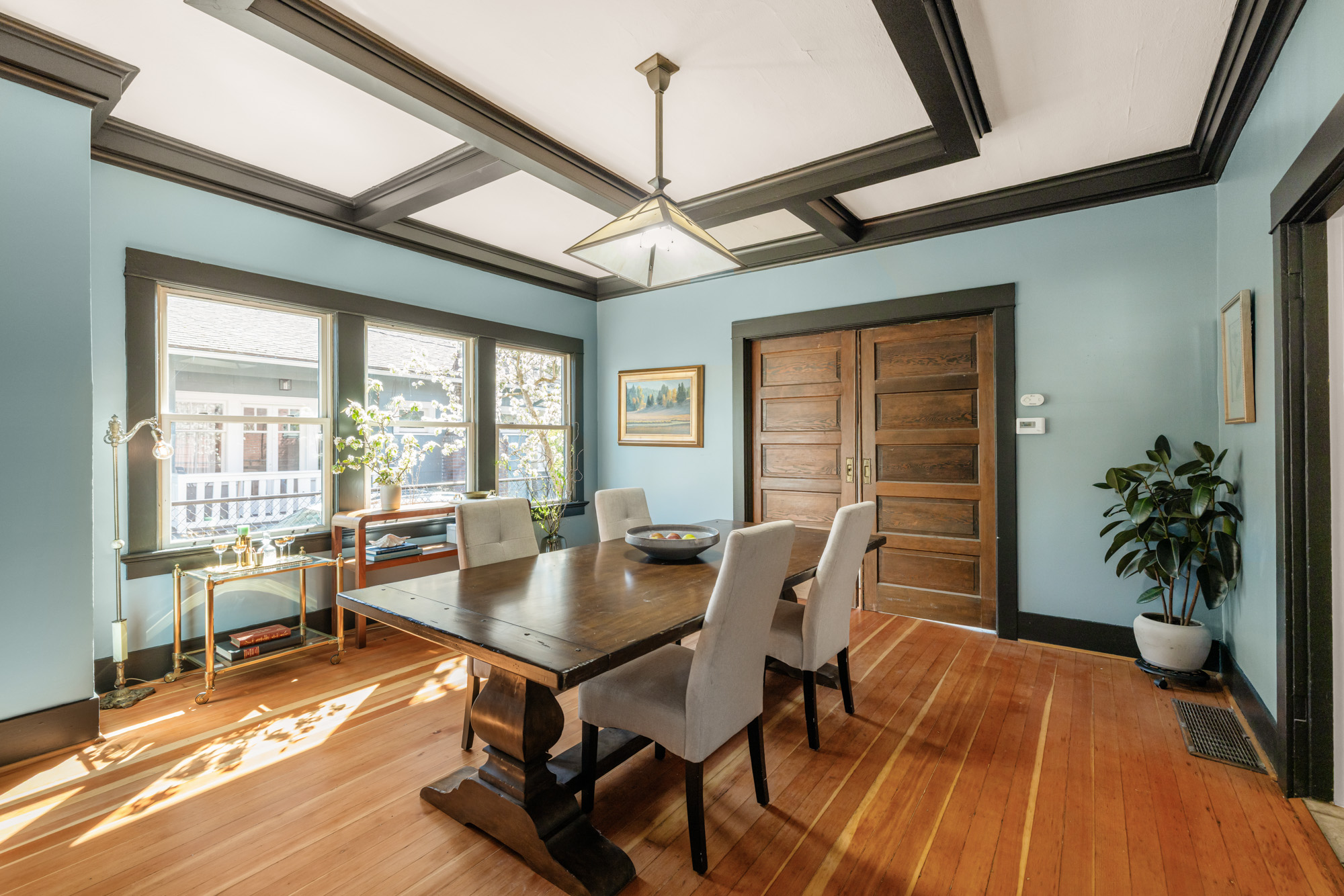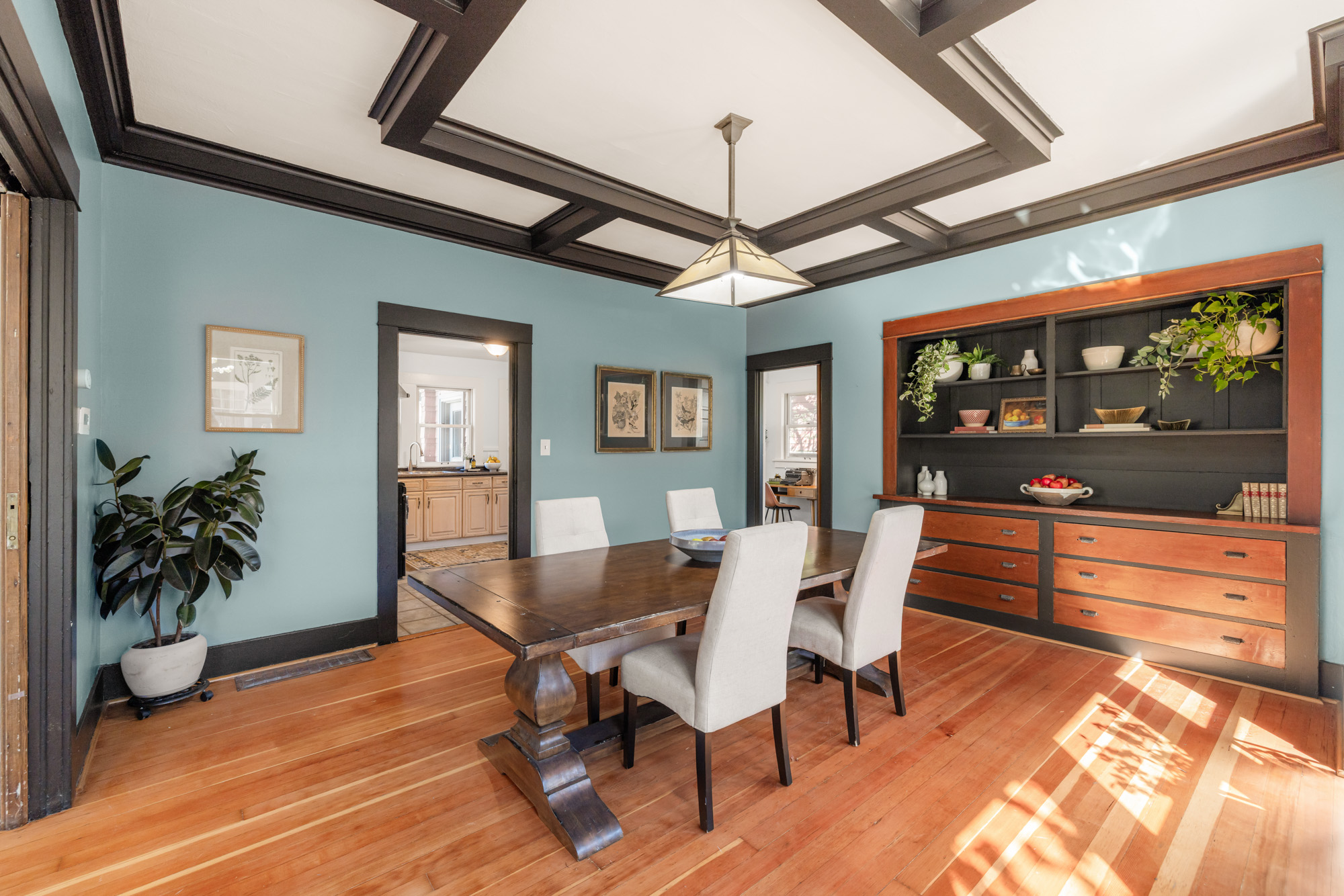 1910 Craftsman in the heart of Alberta Arts. Light-filled with original period detail: dark wood panel pocket doors, fir and oak hardwood floors, black-brick fireplace, and built-in shelving. Dining room with coffered ceiling, dark-painted beams, and floor-to-ceiling built-in hutch. Kitchen with granite countertops, gas range, open wood shelving.