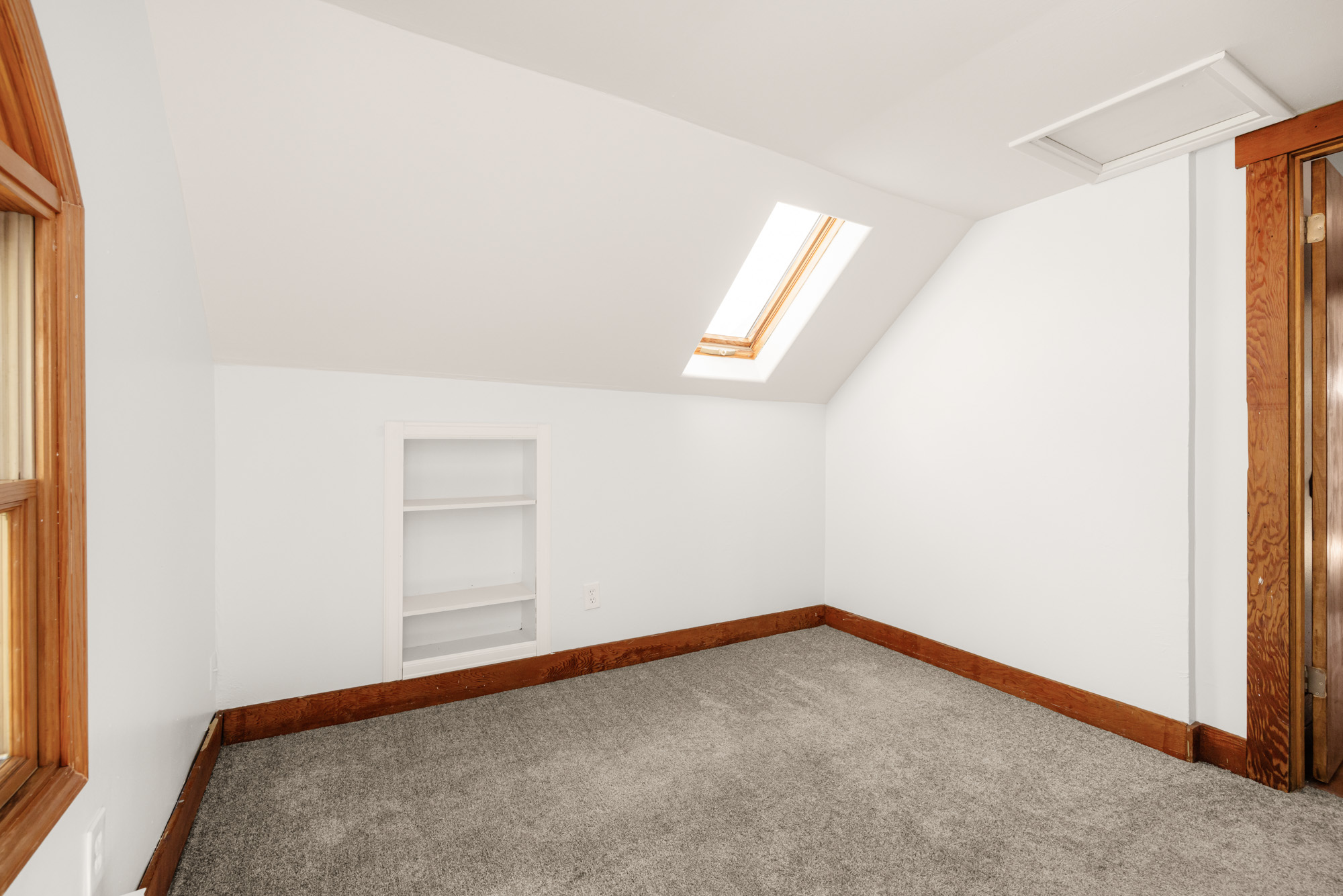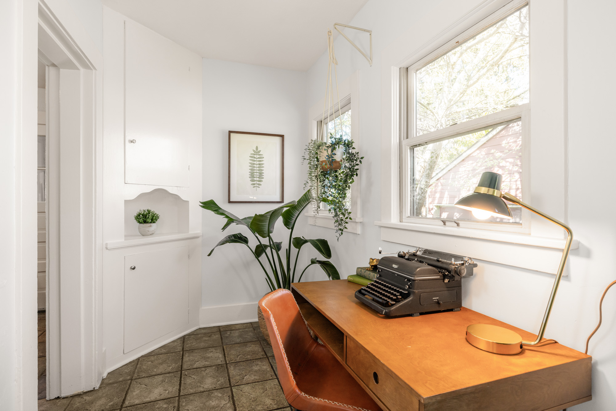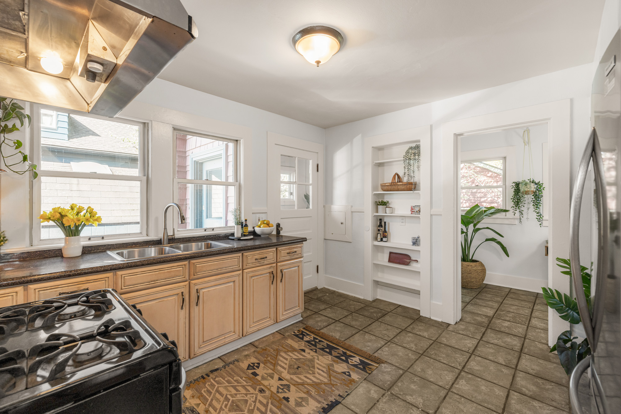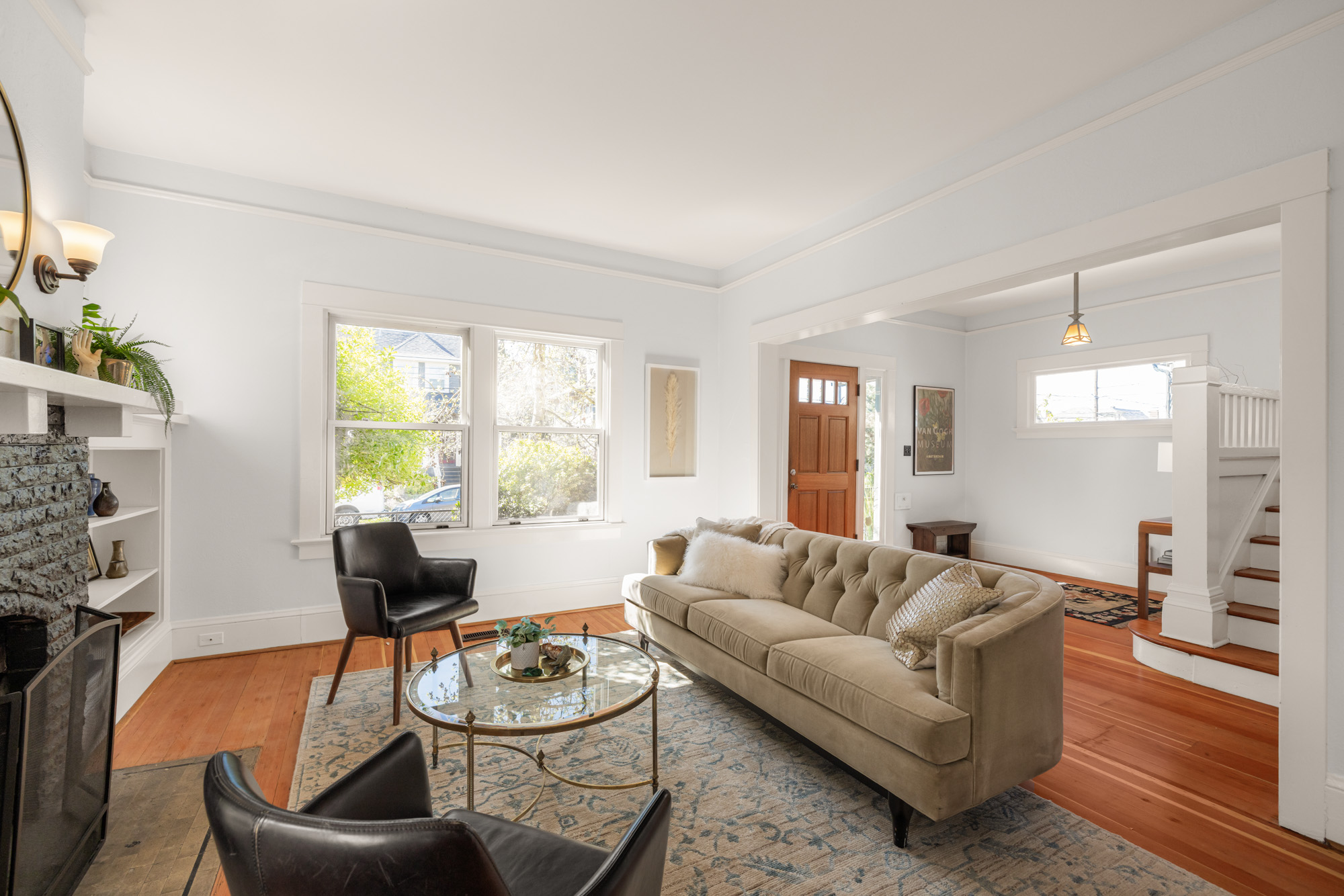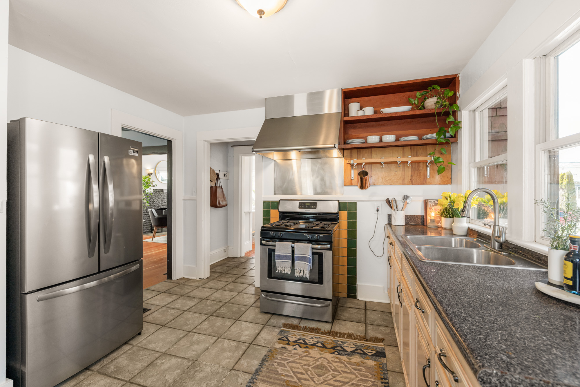 1910 Craftsman in the heart of Alberta Arts. Light-filled with original period detail: dark wood panel pocket doors, fir and oak hardwood floors, black-brick fireplace, and built-in shelving. Dining room with coffered ceiling, dark-painted beams, and floor-to-ceiling built-in hutch. Kitchen with granite countertops, gas range, open wood shelving.