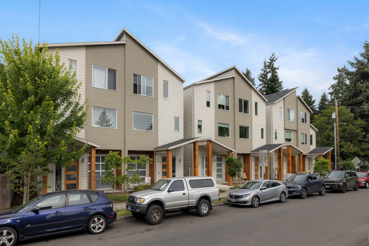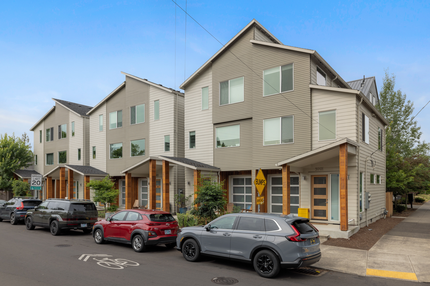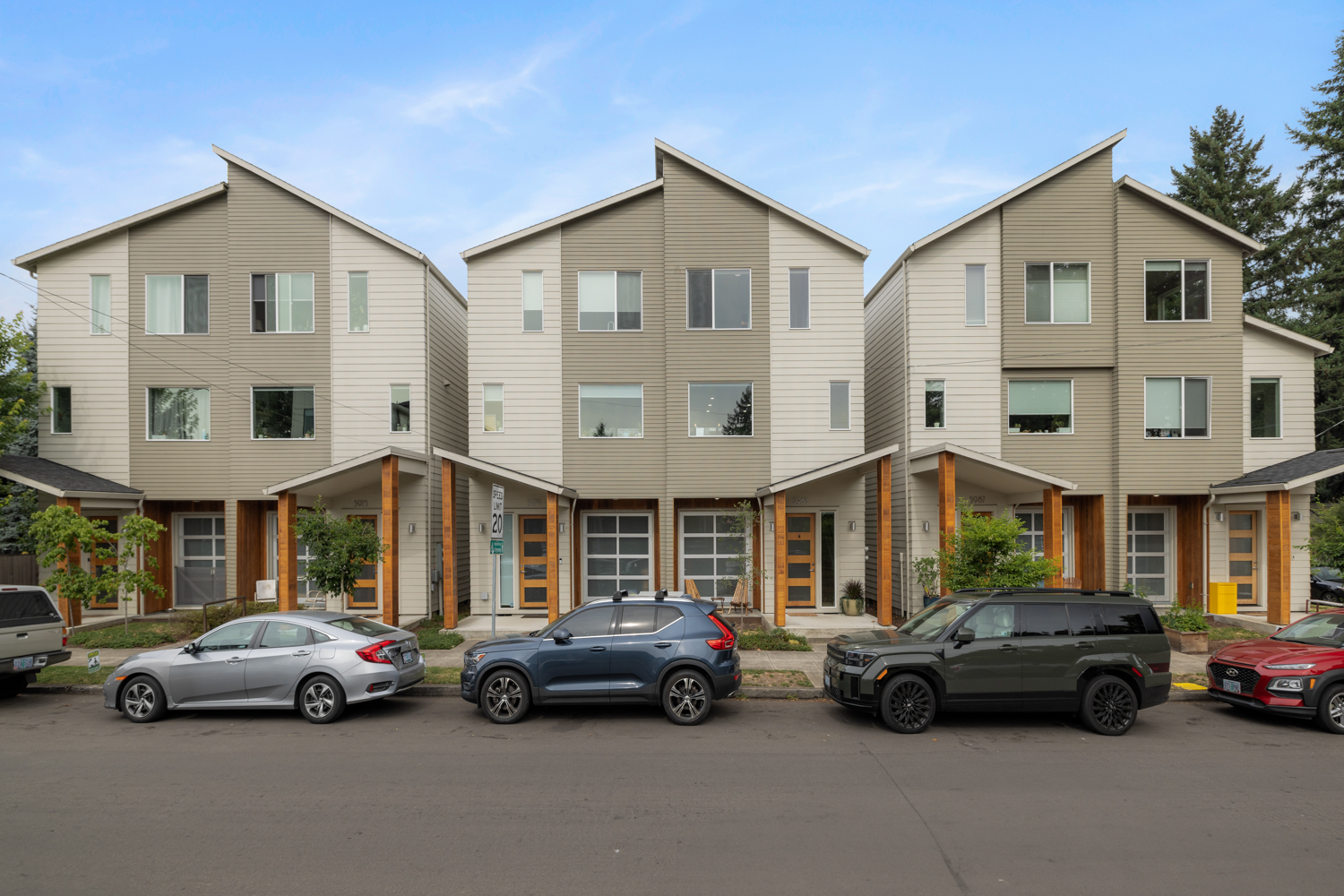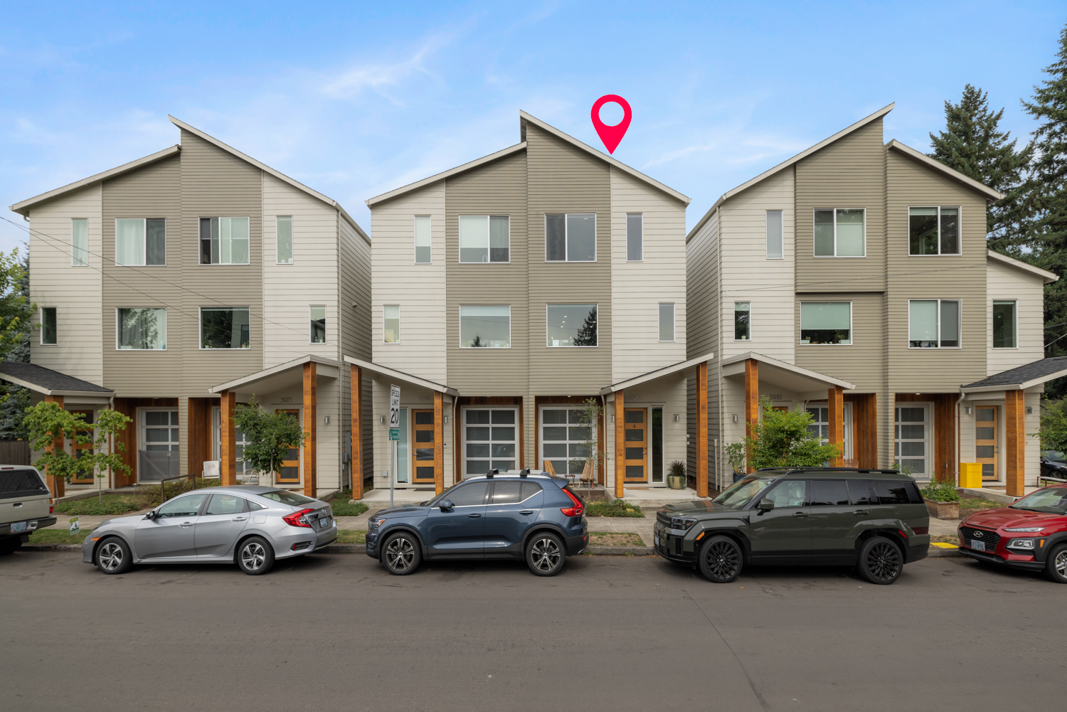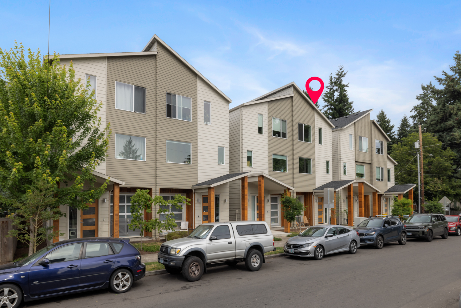 Modern townhouse-style condo in Portland’s Humboldt neighborhood, located at the intersection of the N Ainsworth and N Michigan Greenways—ideal for commuters, creatives, and outdoor enthusiasts alike. This home features 3 en-suite bedrooms and flexible living across three smartly designed levels. The ground floor offers hardwood flooring, a versatile flex space with a roll-up garage door, and a private bedroom with its own entrance—perfect for a guest suite or home office. Upstairs, the open-concept main level is made for entertaining, with an oversized slider that fills the space with natural light, a spacious balcony with a peekaboo view of Forest Park, and a sleek, modern kitchen outfitted with quartz countertops, a pantry, gas range, stainless steel appliances, and an east-facing picture window. The top floor features two vaulted en-suite bedrooms, a convenient laundry closet, and brand-new carpet throughout. Just minutes from Peninsula Park Rose Garden, the MAX line, and the shops and restaurants of Mississippi Street. Taking the N Michigan Greenway offers a direct route to the vibrant Mississippi District too!