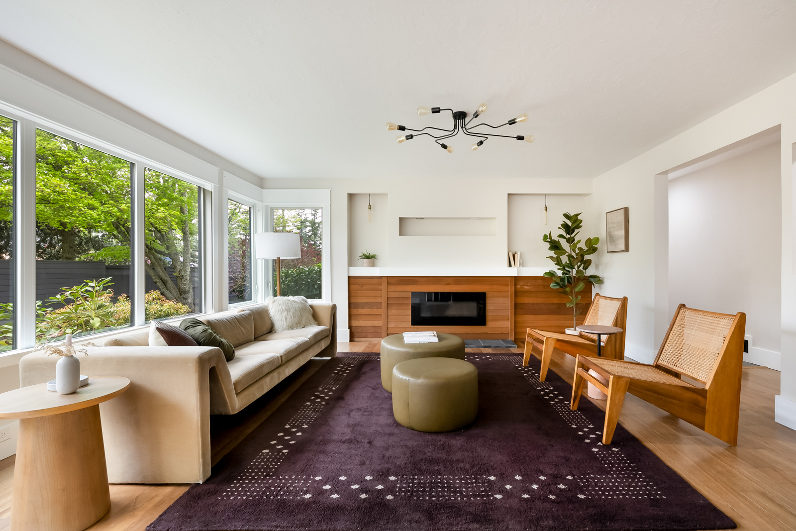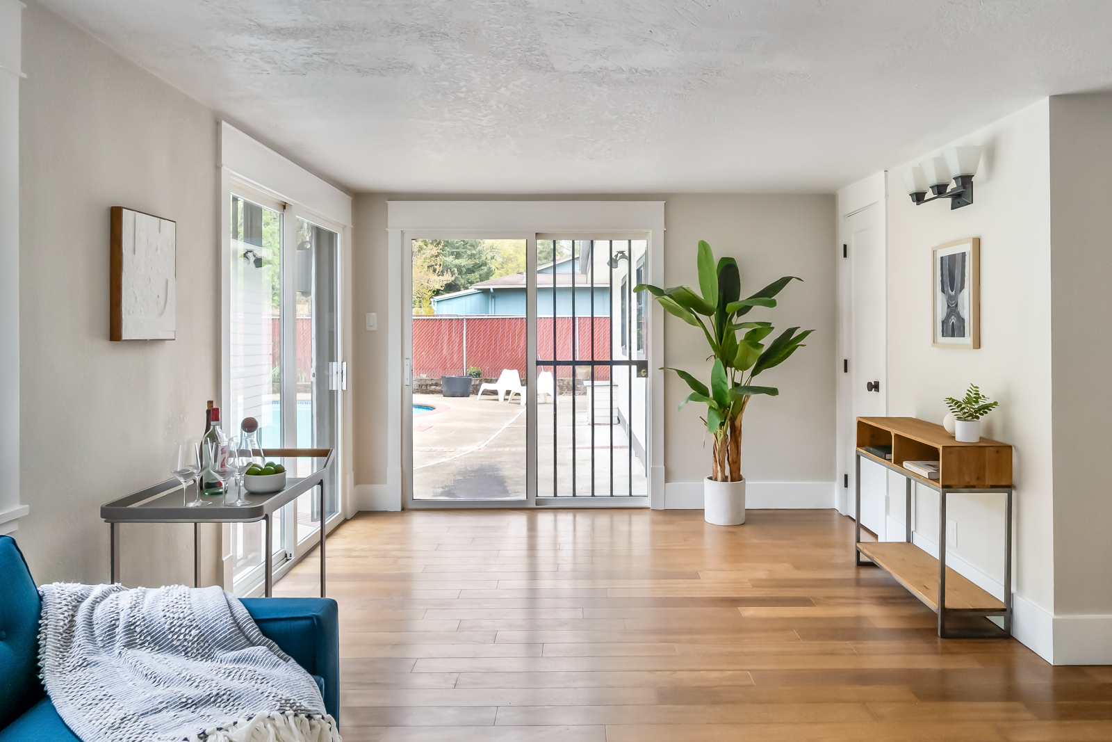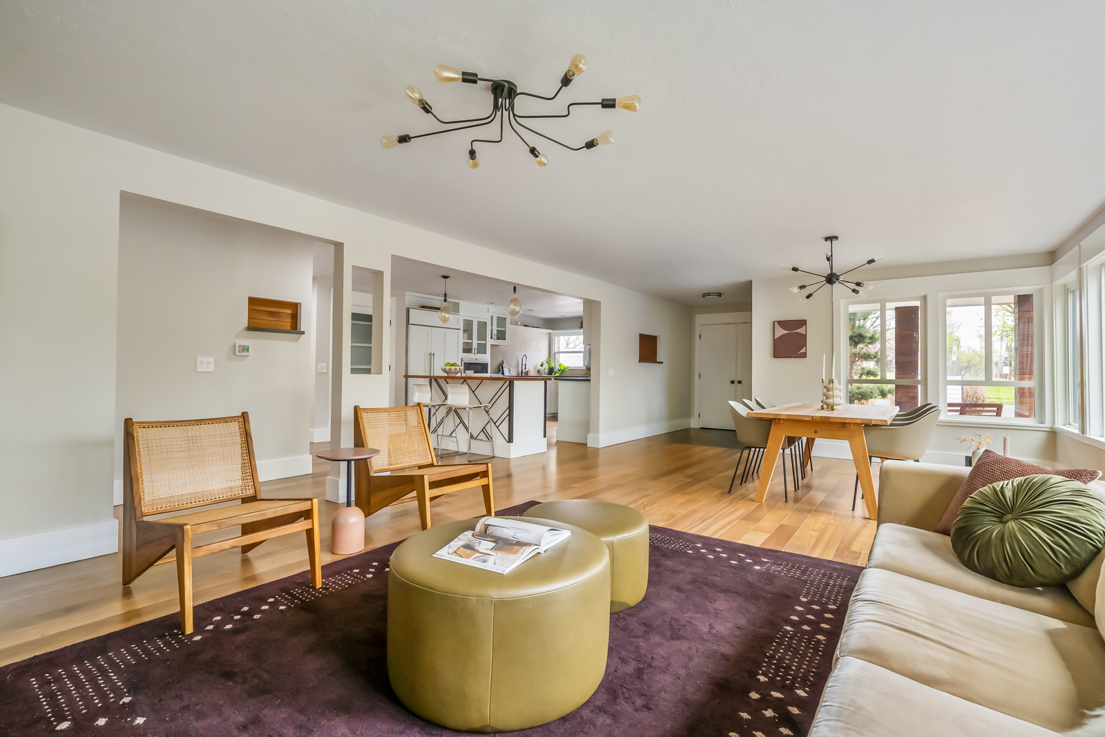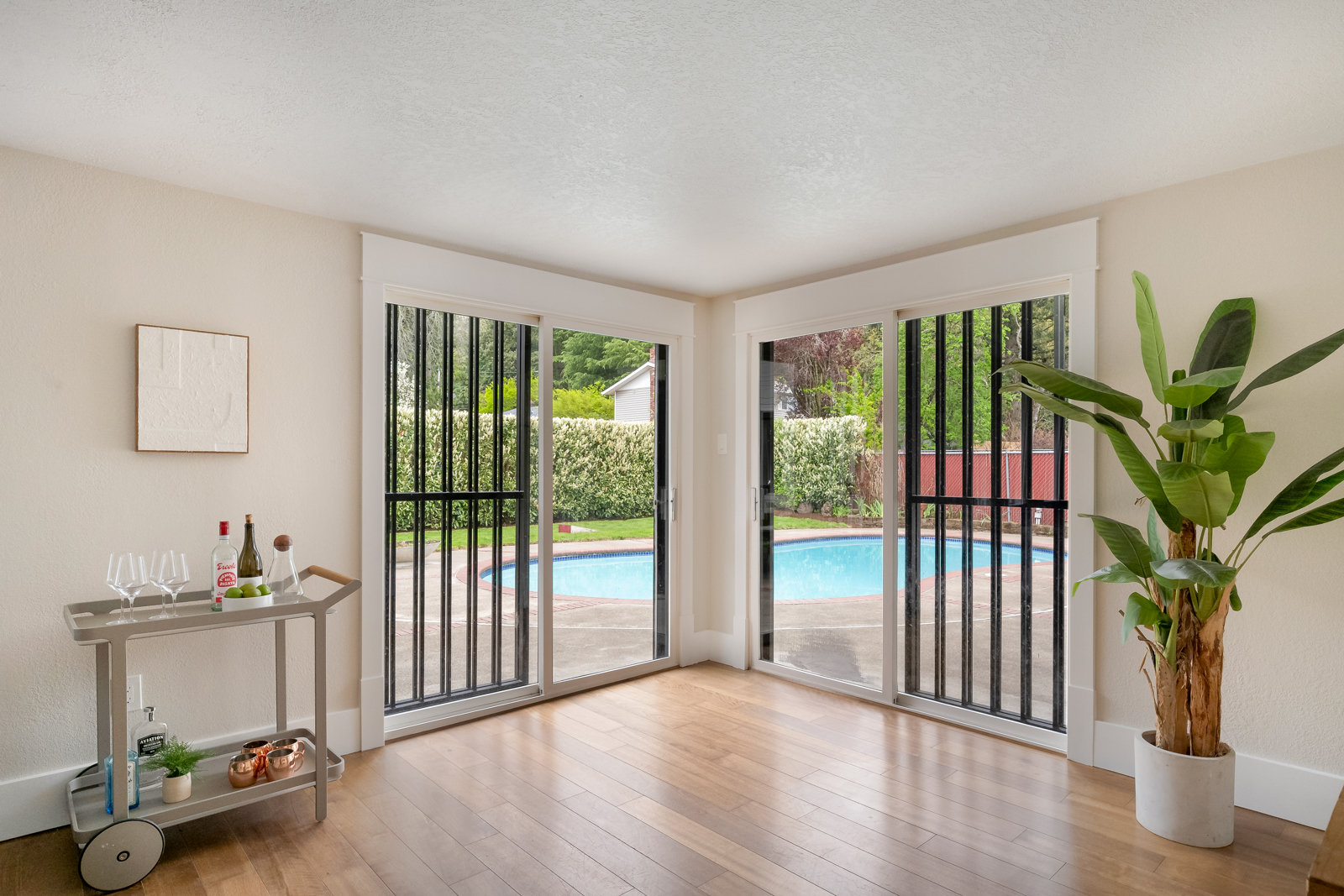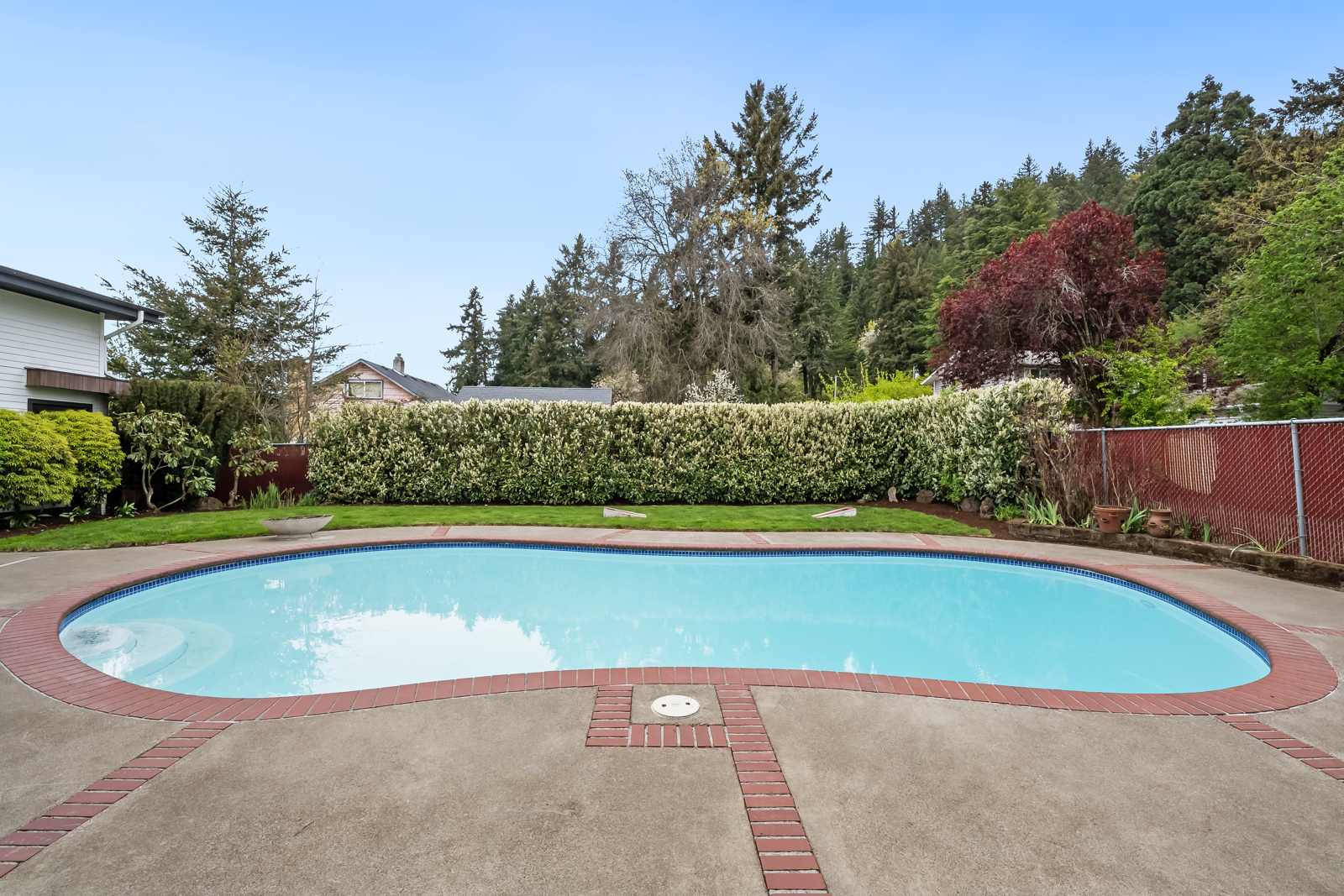 Welcome to a true mid-century oasis. This stunner sits on a corner lot with immaculate, mature landscaping blocking the outside world and creating a luxurious MCM spa-like experience. The primary suite sits pretty with its own private wing, a gorgeous ensuite bathroom with a soaking tub and direct access to a private courtyard. The other three bedrooms reside in the second wing, with a second ensuite. The kitchen is a focal point, featuring sleek cabinetry, a pot filler, an eat bar and high-end appliances. Want to host your perfect mid-century party? There’s a second fridge just for beverages and cocktail creations. The spacious open-concept living area, where the living room, dining room, and kitchen flow seamlessly together is perfect for entertaining or cozying up by the fire on a rainy day. The wall of windows create a relaxing indoor/outdoor vibe. The backyard is a true retreat, featuring a sparkling pool surrounded by a large patio area, perfect for outdoor dining and entertaining. The landscaping is thoughtfully designed to provide both beauty and privacy, with lush greenery and mature trees. This is a truly luxurious single level living with fresh updates that can be difficult to find! Bring your pickiest clients, because this one has it all! The setback, size of the lot and the mature landscaping completely block this home from 92nd Ave. Easy access to Rocky Butte.
