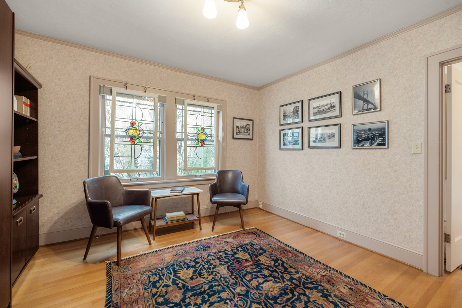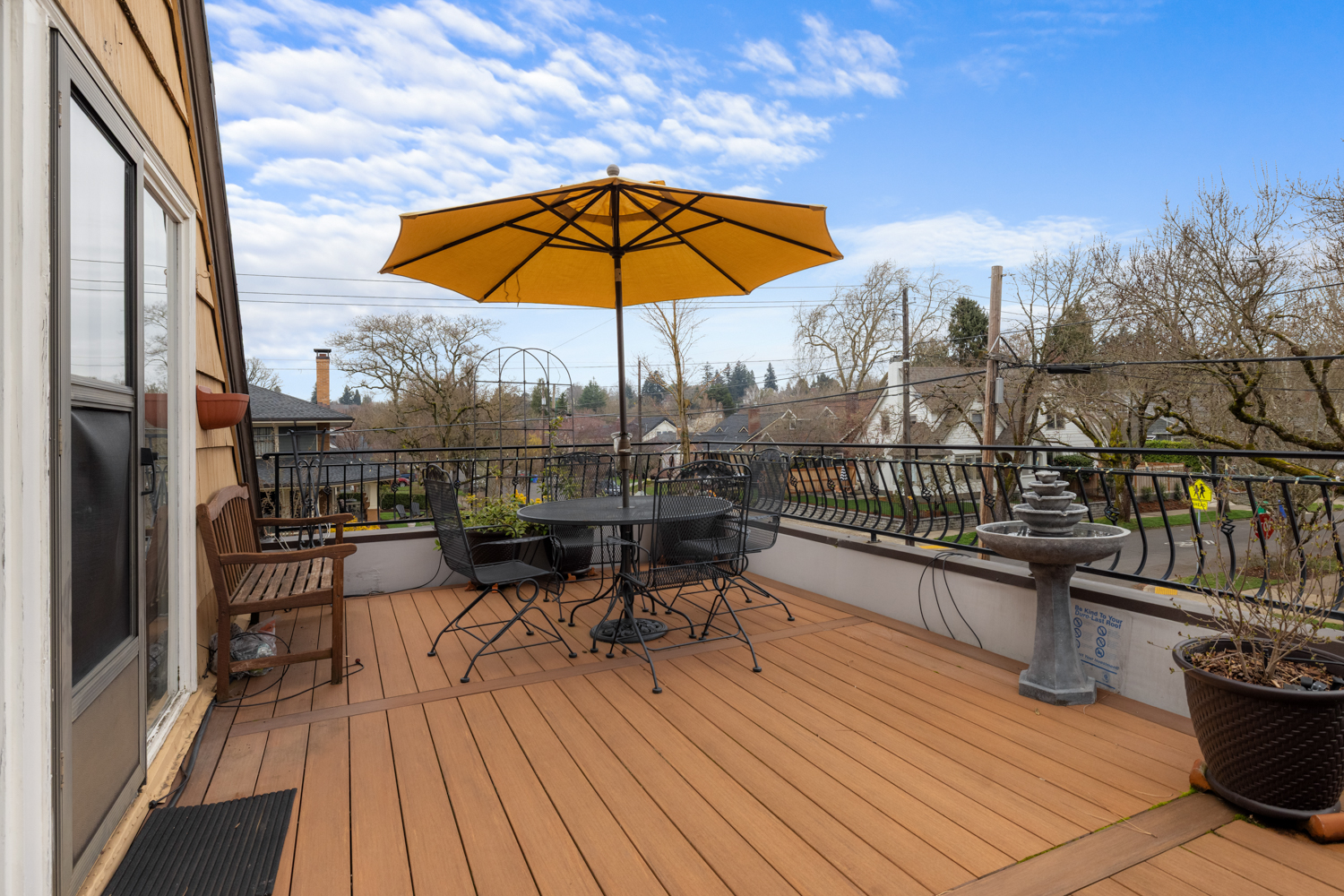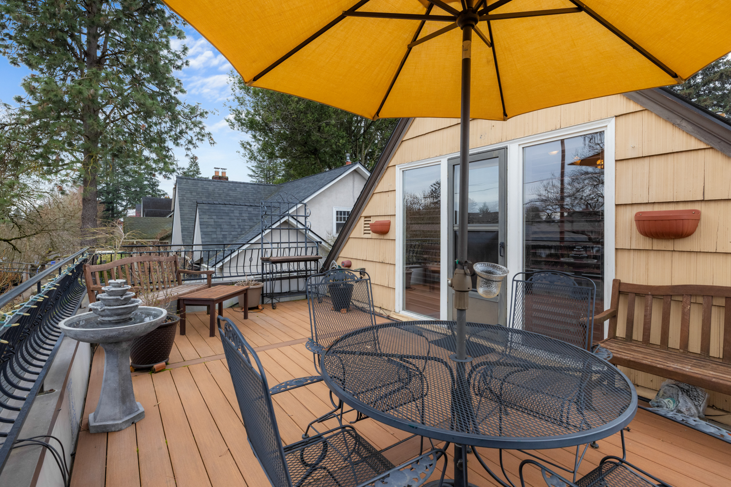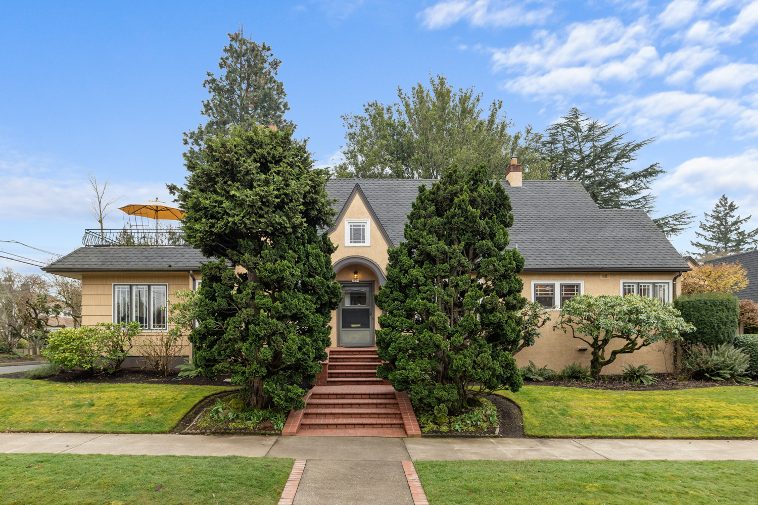 This elegant 1926 home, where refined European ambiance meets sophisticated updates, occupies a prized corner lot in historic Irvington. Step inside to discover bright spaces with beautifully-maintained hardwood floors, intricate crown molding, and an inviting entryway. The spacious living room features a gas fireplace and French doors opening to an east-facing sunroom bathed in morning light. The formal dining room showcases custom built-in glass cabinets with black granite countertops and museum-quality display lighting—perfect for showcasing treasured collections. In the updated kitchen, a long island provides ample prep space, complemented by a sun-drenched breakfast nook. Two generous main-level bedrooms, one featuring a space-saving Murphy bed with built-in storage, share a full bath with distinctive tin ceiling, penny tile flooring, and subway tile walls. Upstairs, a primary bedroom offers abundant natural light, custom built-ins, and a spa-inspired bathroom featuring a clawfoot tub, rain showerhead, built-in bench, and skylight. The room opens to a private sun deck with wrought iron railing, a tiered fountain, innovative A-tech flooring, and a custom drip system for container gardens—an ideal spot for morning coffee or evening relaxation. A large, well-lit basement provides practical storage and laundry facilities. Thoughtful modern systems include dual HVAC with separate heat and air conditioning for each level, an automatic attic fan, and a six-zone in-ground sprinkler system with dedicated drip irrigation for the beds. In the backyard, a brick patio creates an intimate entertaining space surrounded by mature patio gardens. Nestled within blocks of coffee shops, boutiques, and neighborhood restaurants, and only minutes from Whole Foods, this distinguished residence offers a rare opportunity in one of the city’s most coveted neighborhoods.
