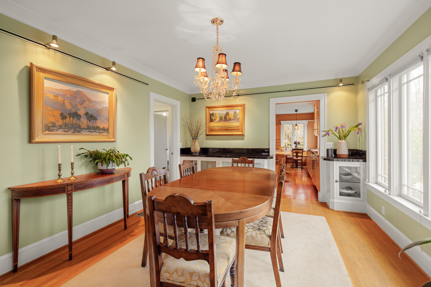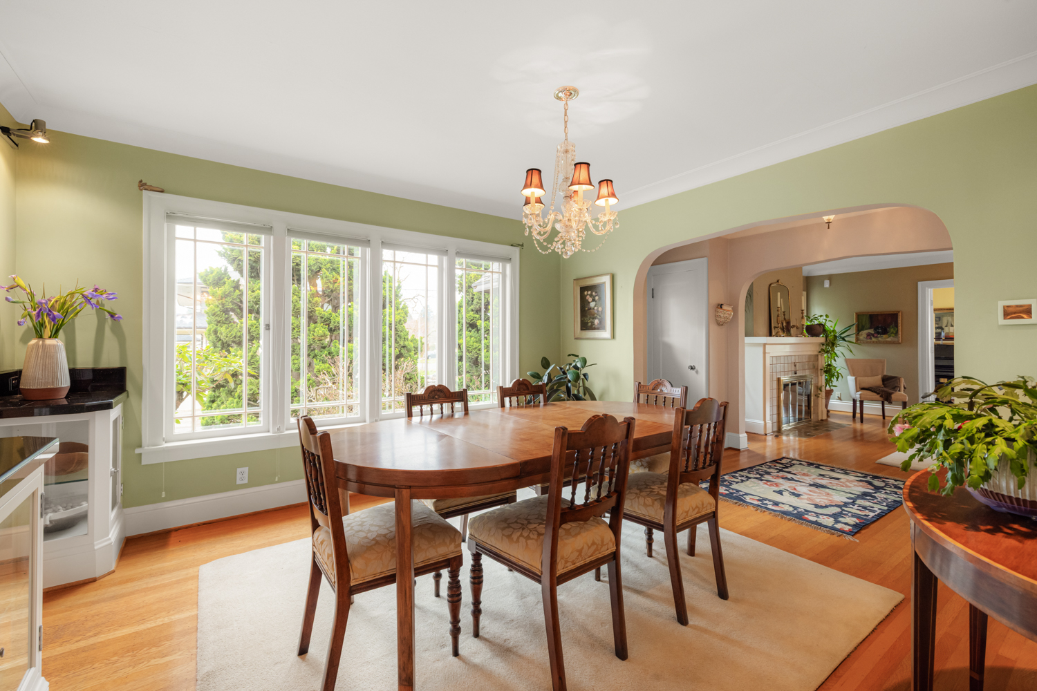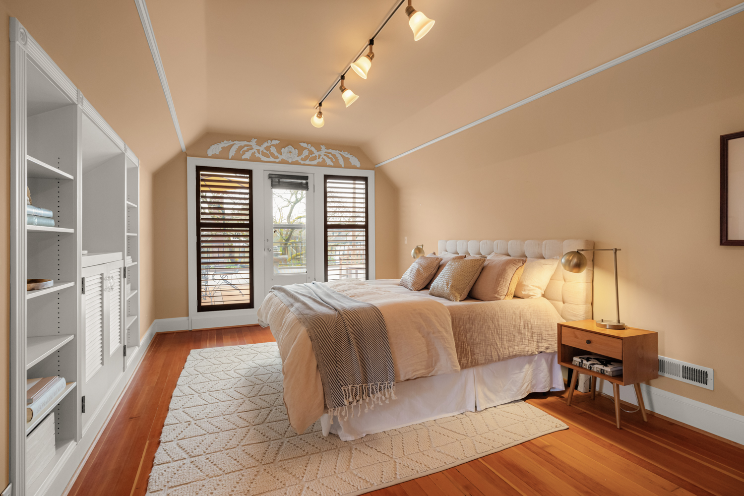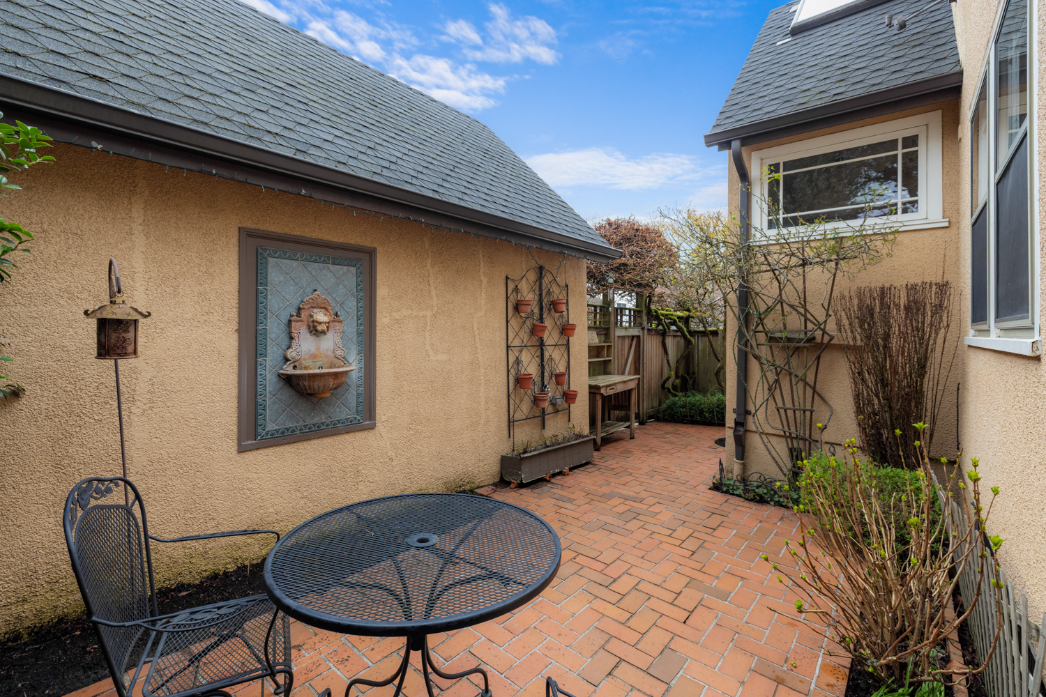 This elegant 1926 home, where refined European ambiance meets sophisticated updates, occupies a prized corner lot in historic Irvington. Step inside to discover bright spaces with beautifully-maintained hardwood floors, intricate crown molding, and an inviting entryway. The spacious living room features a gas fireplace and French doors opening to an east-facing sunroom bathed in morning light. The formal dining room showcases custom built-in glass cabinets with black granite countertops and museum-quality display lighting—perfect for showcasing treasured collections. In the updated kitchen, a long island provides ample prep space, complemented by a sun-drenched breakfast nook. Two generous main-level bedrooms, one featuring a space-saving Murphy bed with built-in storage, share a full bath with distinctive tin ceiling, penny tile flooring, and subway tile walls. Upstairs, a primary bedroom offers abundant natural light, custom built-ins, and a spa-inspired bathroom featuring a clawfoot tub, rain showerhead, built-in bench, and skylight. The room opens to a private sun deck with wrought iron railing, a tiered fountain, innovative A-tech flooring, and a custom drip system for container gardens—an ideal spot for morning coffee or evening relaxation. A large, well-lit basement provides practical storage and laundry facilities. Thoughtful modern systems include dual HVAC with separate heat and air conditioning for each level, an automatic attic fan, and a six-zone in-ground sprinkler system with dedicated drip irrigation for the beds. In the backyard, a brick patio creates an intimate entertaining space surrounded by mature patio gardens. Nestled within blocks of coffee shops, boutiques, and neighborhood restaurants, and only minutes from Whole Foods, this distinguished residence offers a rare opportunity in one of the city’s most coveted neighborhoods.