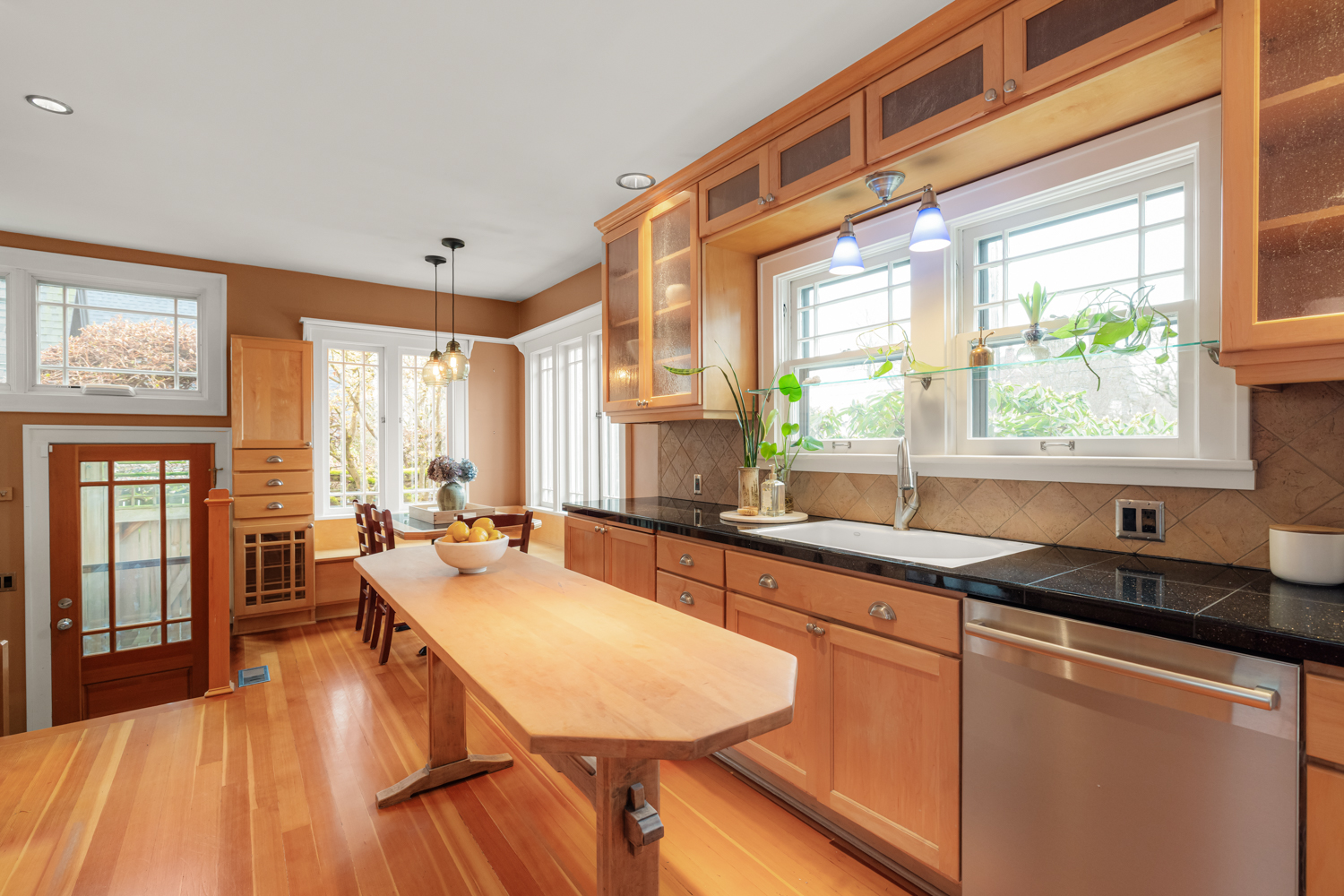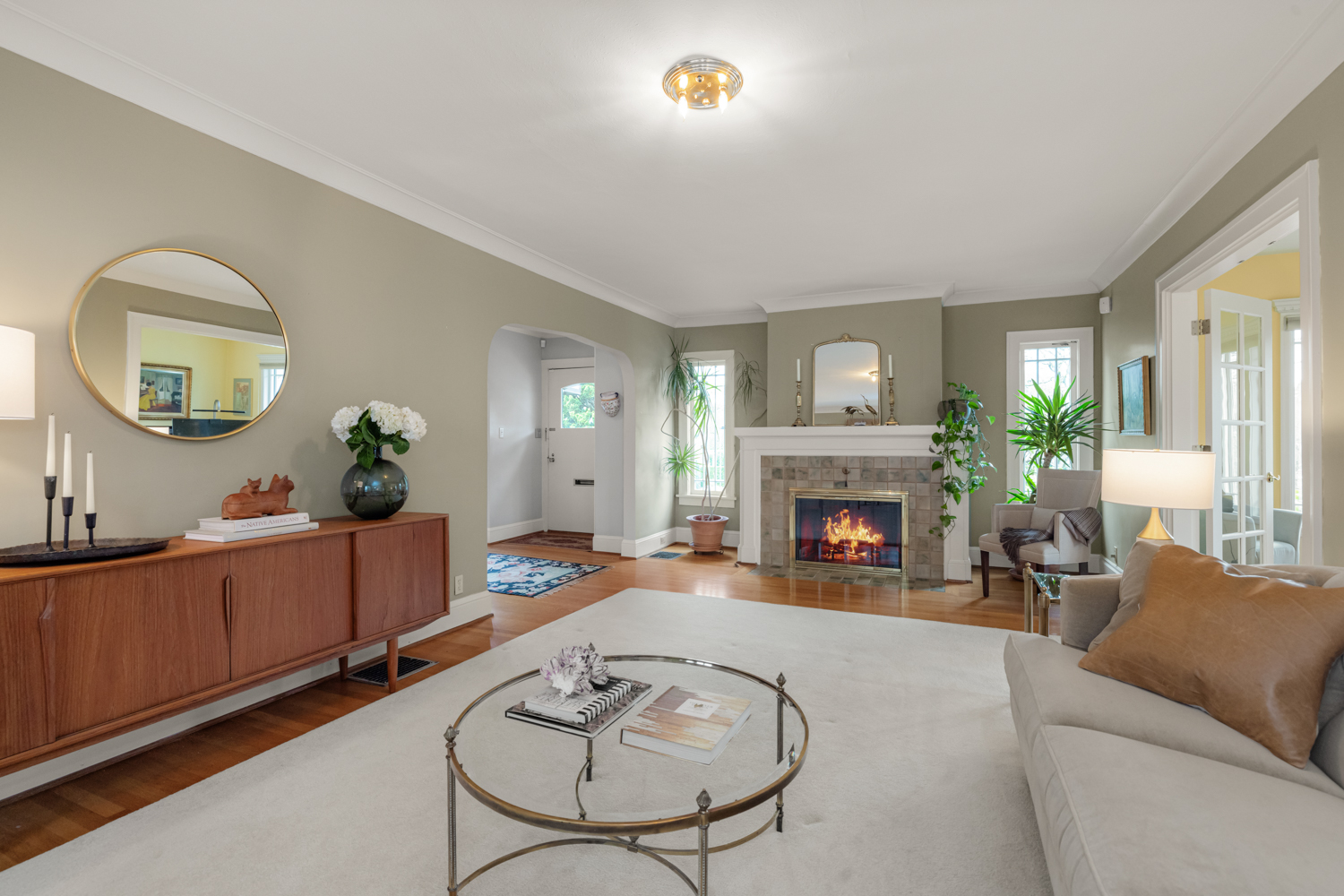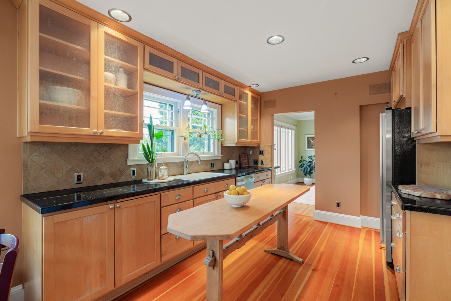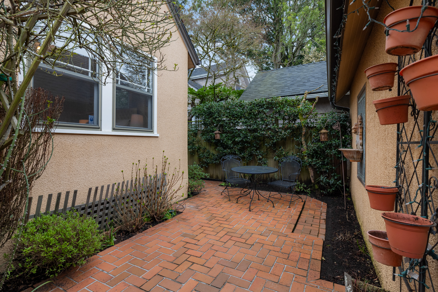 This elegant 1926 home, where refined European ambiance meets sophisticated updates, occupies a prized corner lot in historic Irvington. Step inside to discover bright spaces with beautifully-maintained hardwood floors, intricate crown molding, and an inviting entryway. The spacious living room features a gas fireplace and French doors opening to an east-facing sunroom bathed in morning light. The formal dining room showcases custom built-in glass cabinets with black granite countertops and museum-quality display lighting—perfect for showcasing treasured collections. In the updated kitchen, a long island provides ample prep space, complemented by a sun-drenched breakfast nook. Two generous main-level bedrooms, one featuring a space-saving Murphy bed with built-in storage, share a full bath with distinctive tin ceiling, penny tile flooring, and subway tile walls. Upstairs, a primary bedroom offers abundant natural light, custom built-ins, and a spa-inspired bathroom featuring a clawfoot tub, rain showerhead, built-in bench, and skylight. The room opens to a private sun deck with wrought iron railing, a tiered fountain, innovative A-tech flooring, and a custom drip system for container gardens—an ideal spot for morning coffee or evening relaxation. A large, well-lit basement provides practical storage and laundry facilities. Thoughtful modern systems include dual HVAC with separate heat and air conditioning for each level, an automatic attic fan, and a six-zone in-ground sprinkler system with dedicated drip irrigation for the beds. In the backyard, a brick patio creates an intimate entertaining space surrounded by mature patio gardens. Nestled within blocks of coffee shops, boutiques, and neighborhood restaurants, and only minutes from Whole Foods, this distinguished residence offers a rare opportunity in one of the city’s most coveted neighborhoods.