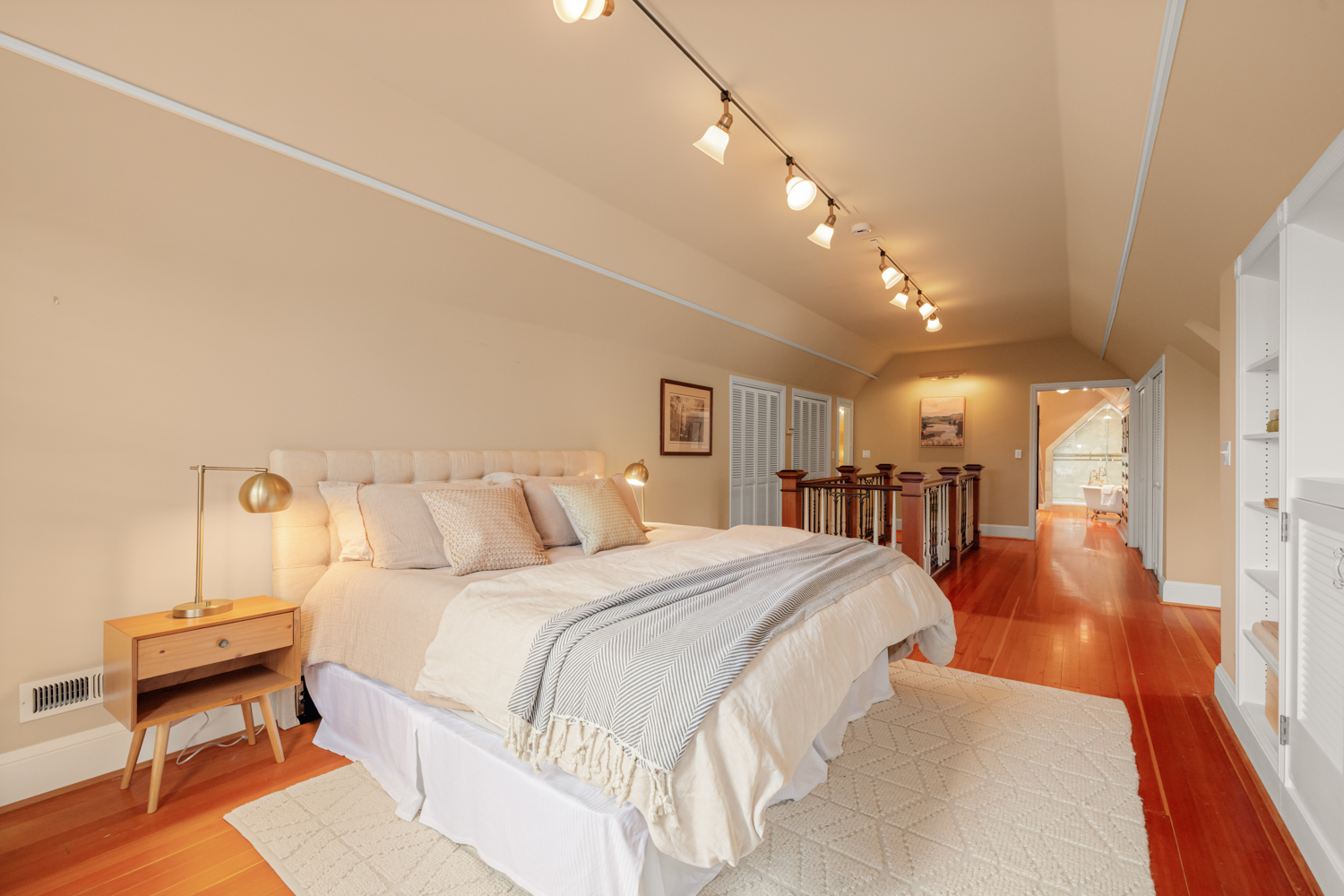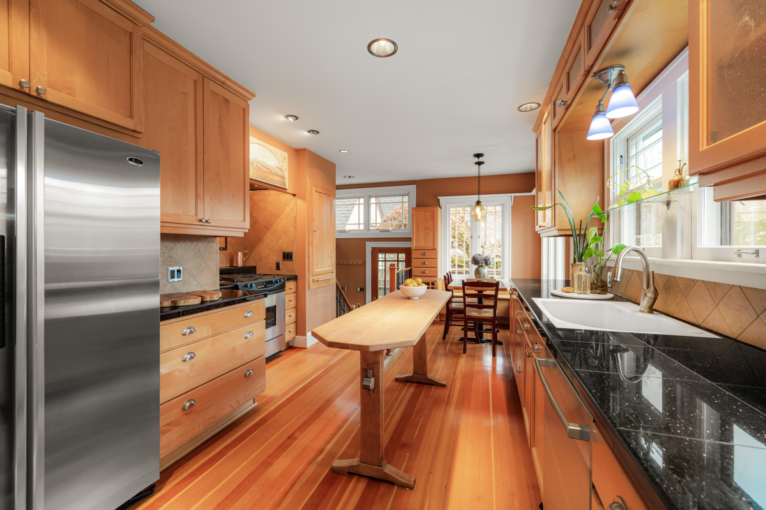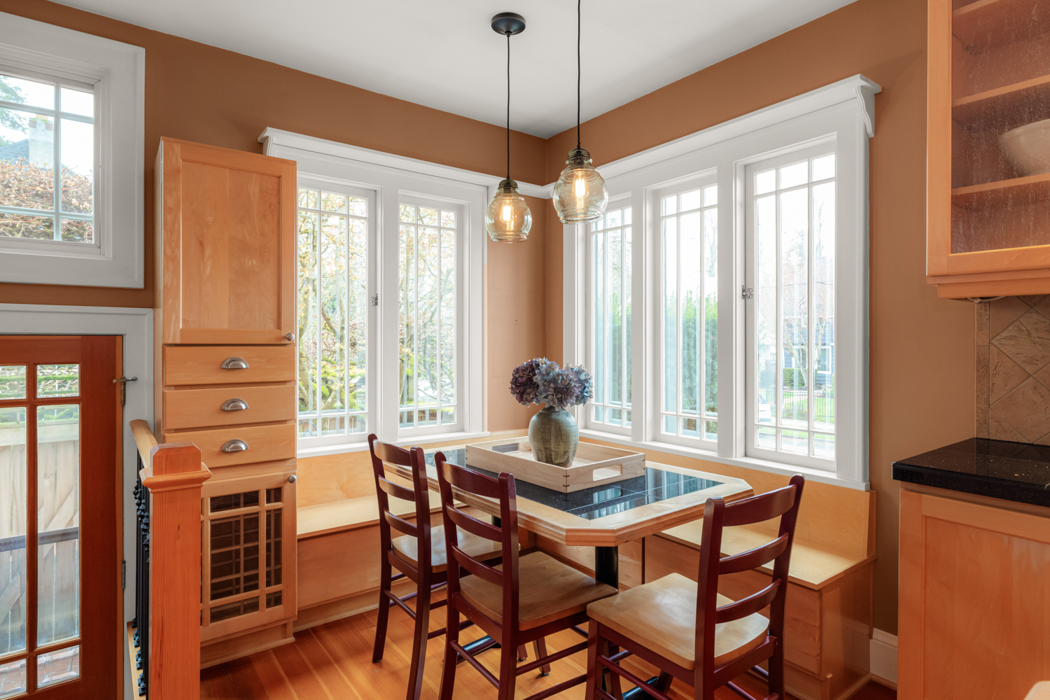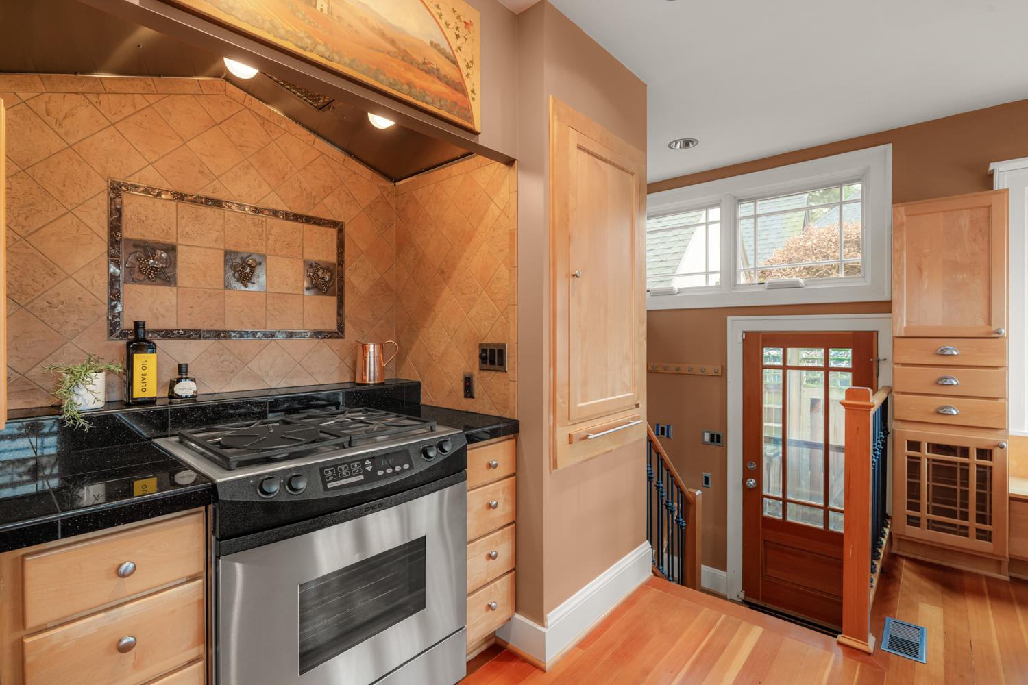 This elegant 1926 home, where refined European ambiance meets sophisticated updates, occupies a prized corner lot in historic Irvington. Step inside to discover bright spaces with beautifully-maintained hardwood floors, intricate crown molding, and an inviting entryway. The spacious living room features a gas fireplace and French doors opening to an east-facing sunroom bathed in morning light. The formal dining room showcases custom built-in glass cabinets with black granite countertops and museum-quality display lighting—perfect for showcasing treasured collections. In the updated kitchen, a long island provides ample prep space, complemented by a sun-drenched breakfast nook. Two generous main-level bedrooms, one featuring a space-saving Murphy bed with built-in storage, share a full bath with distinctive tin ceiling, penny tile flooring, and subway tile walls. Upstairs, a primary bedroom offers abundant natural light, custom built-ins, and a spa-inspired bathroom featuring a clawfoot tub, rain showerhead, built-in bench, and skylight. The room opens to a private sun deck with wrought iron railing, a tiered fountain, innovative A-tech flooring, and a custom drip system for container gardens—an ideal spot for morning coffee or evening relaxation. A large, well-lit basement provides practical storage and laundry facilities. Thoughtful modern systems include dual HVAC with separate heat and air conditioning for each level, an automatic attic fan, and a six-zone in-ground sprinkler system with dedicated drip irrigation for the beds. In the backyard, a brick patio creates an intimate entertaining space surrounded by mature patio gardens. Nestled within blocks of coffee shops, boutiques, and neighborhood restaurants, and only minutes from Whole Foods, this distinguished residence offers a rare opportunity in one of the city’s most coveted neighborhoods.