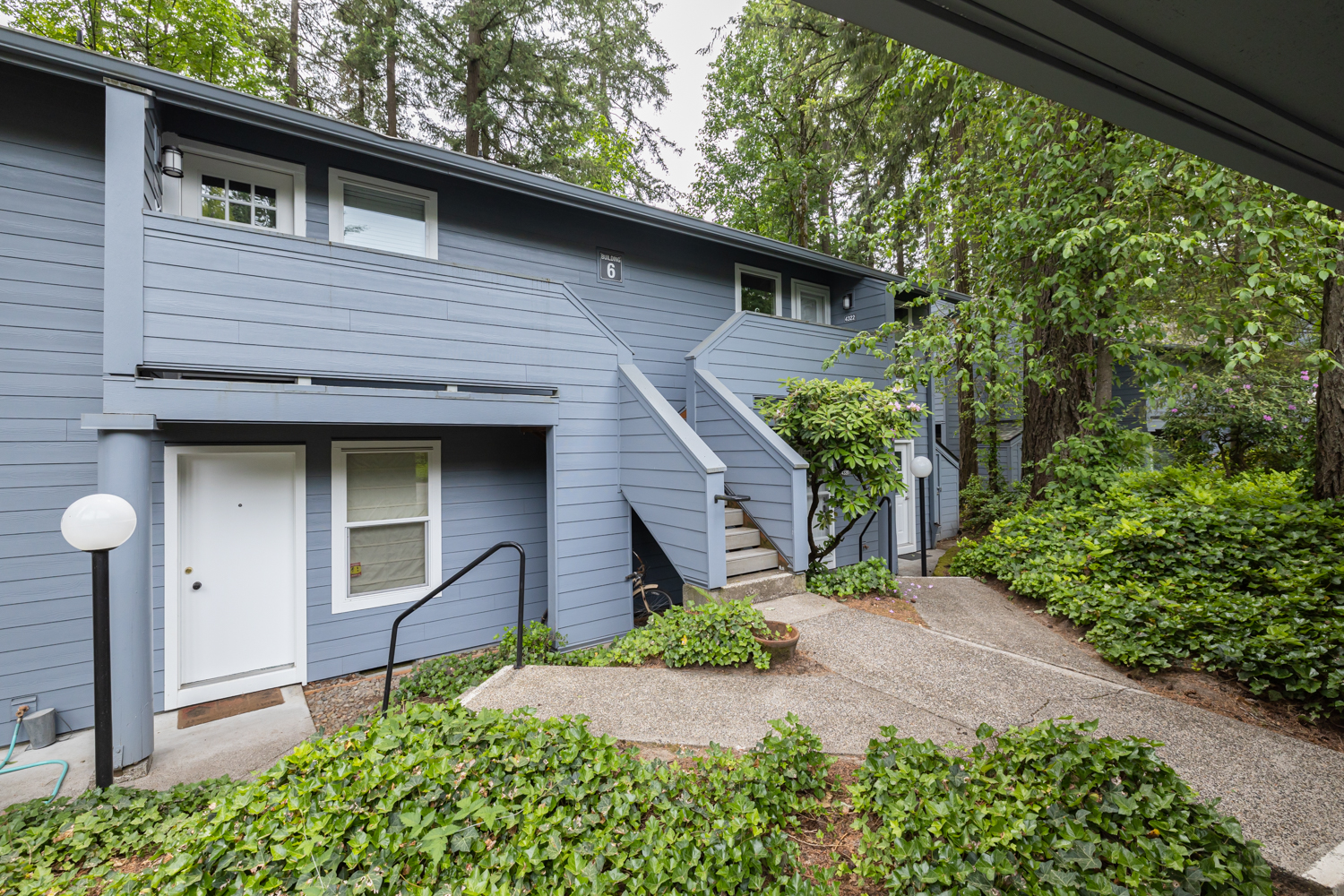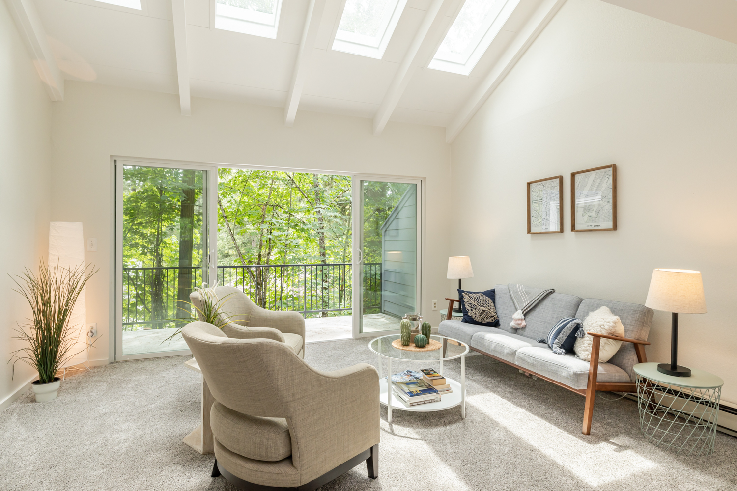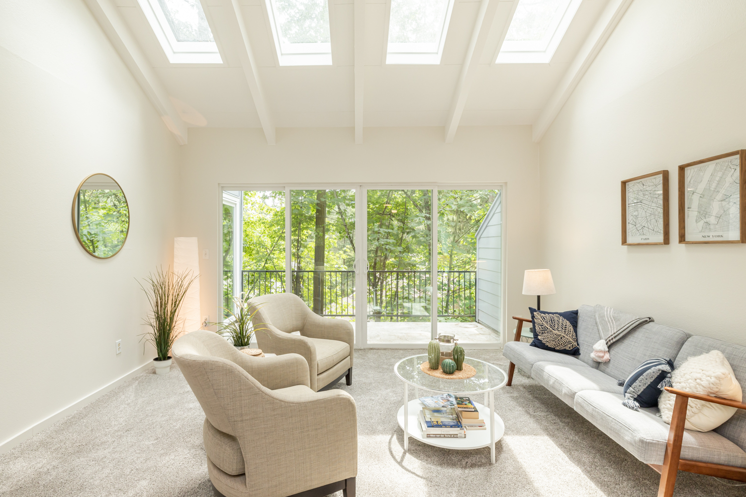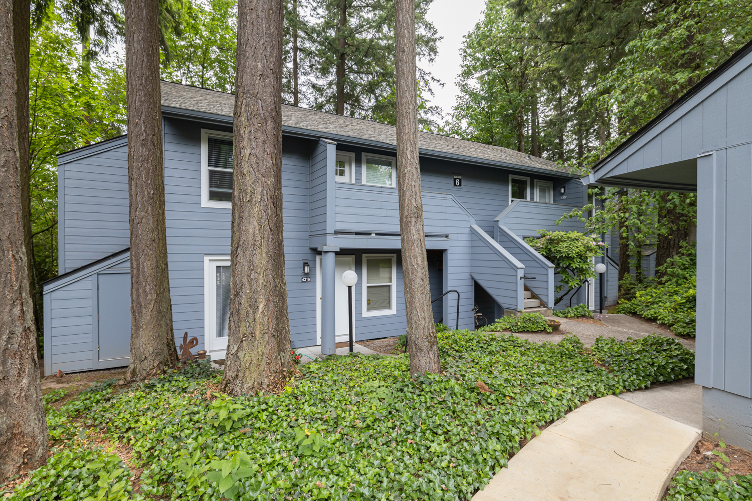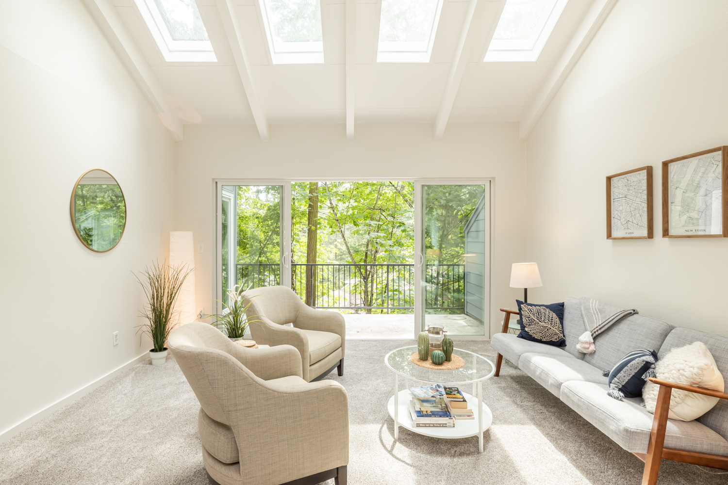 Discover a captivating upper floor condo nestled in the serene woods of SW Portland. This delightful residence offers an enchanting retreat with the perfect blend of modern comforts and rustic charm. Step inside to find a spacious living area adorned with vaulted ceilings, accentuating the sense of openness and airiness. “Natural light pours in through skylights (unique to any other home within this community), illuminating the space transformed by brand new paint, carpet, and flooring, providing a contemporary yet cozy ambiance.”
