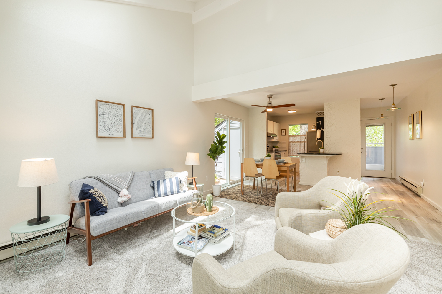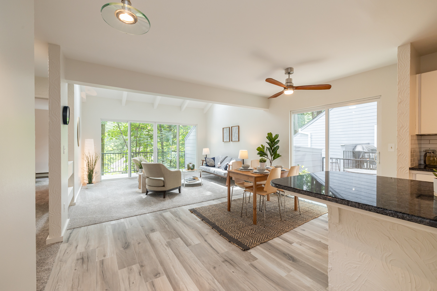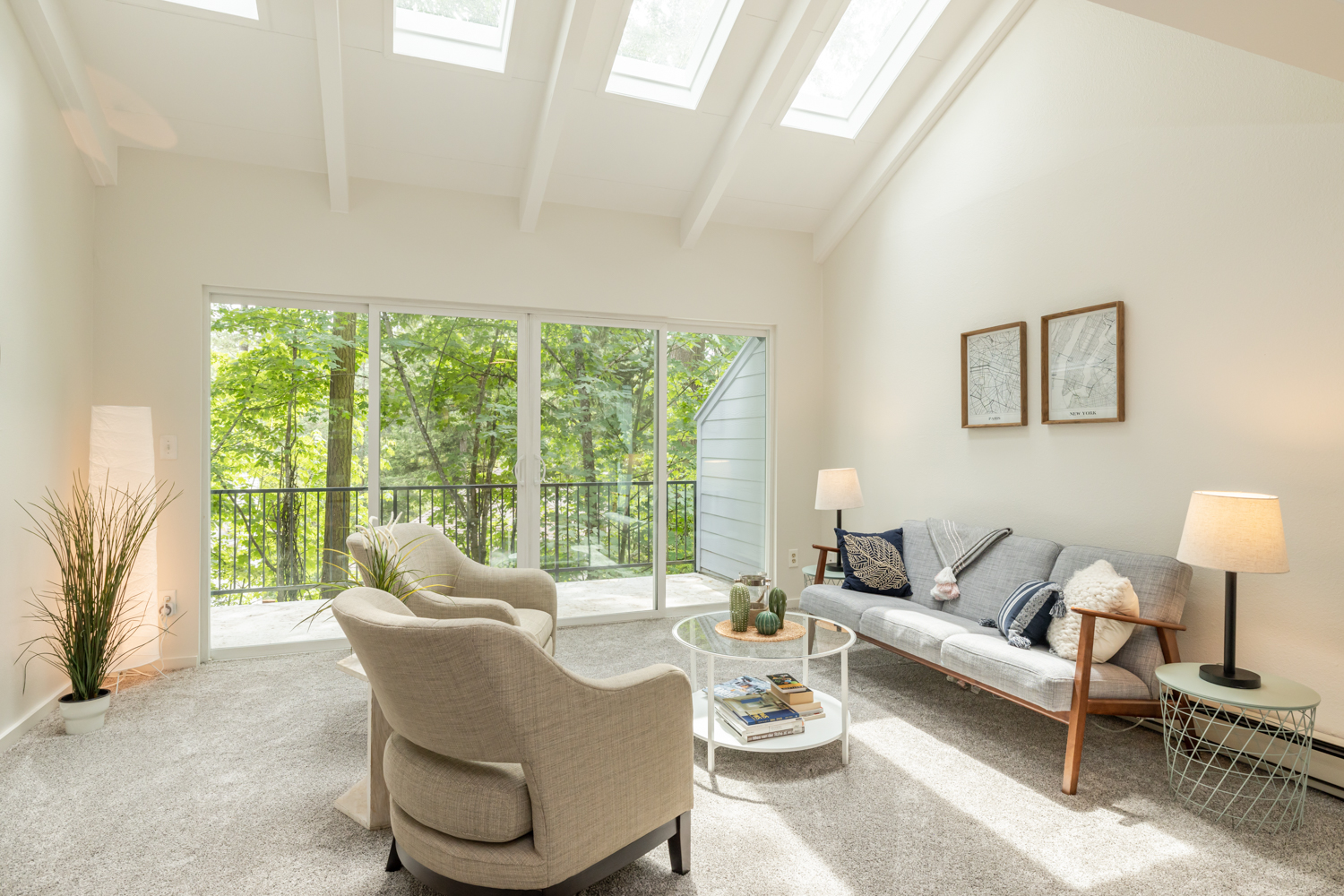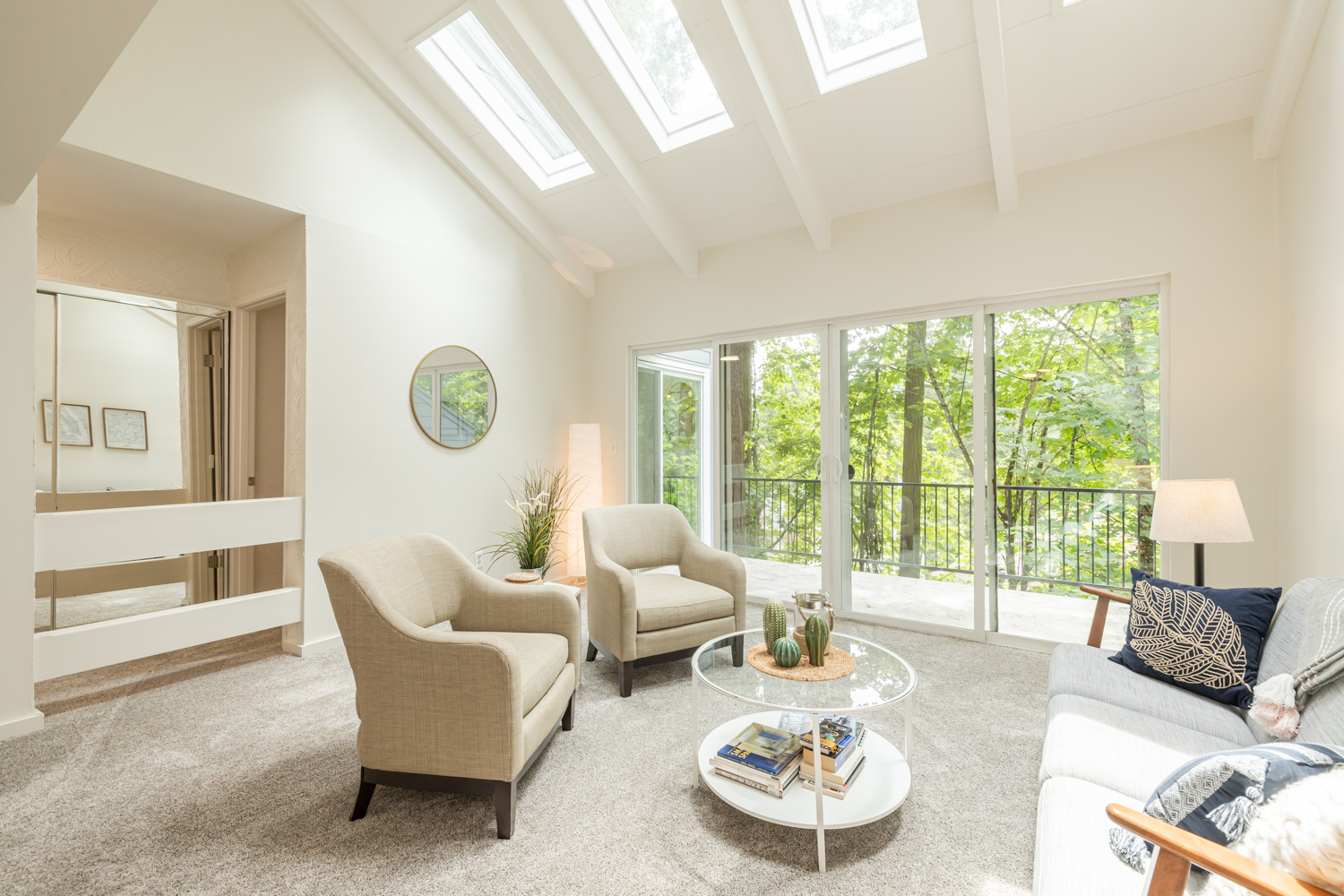 Discover a captivating upper floor condo nestled in the serene woods of SW Portland. This delightful residence offers an enchanting retreat with the perfect blend of modern comforts and rustic charm. Step inside to find a spacious living area adorned with vaulted ceilings, accentuating the sense of openness and airiness. “Natural light pours in through skylights (unique to any other home within this community), illuminating the space transformed by brand new paint, carpet, and flooring, providing a contemporary yet cozy ambiance.”
