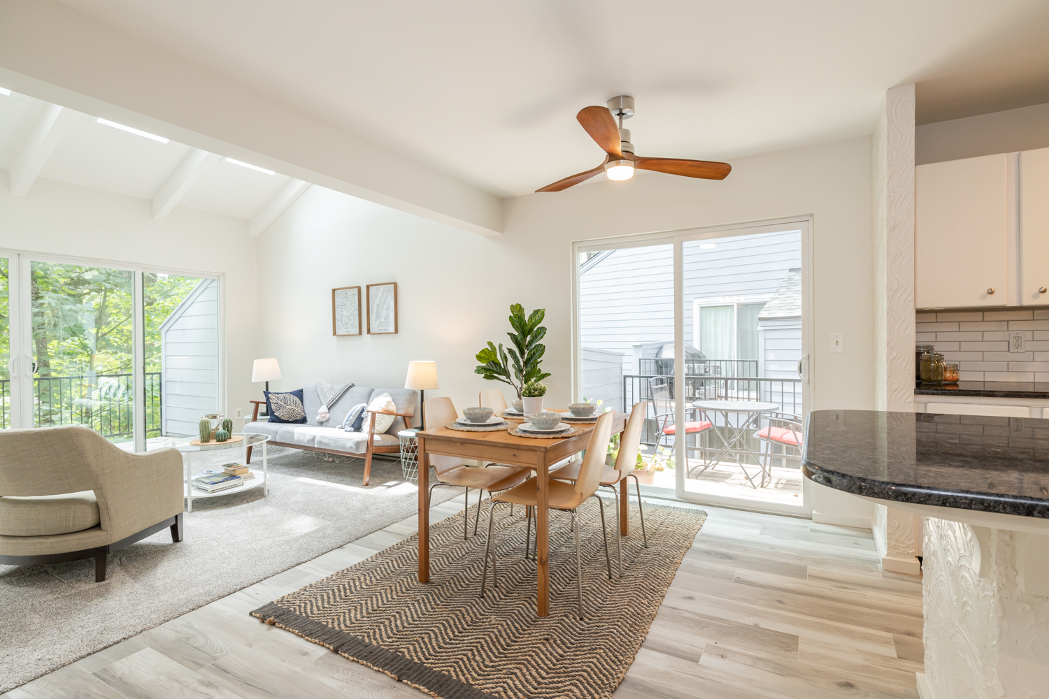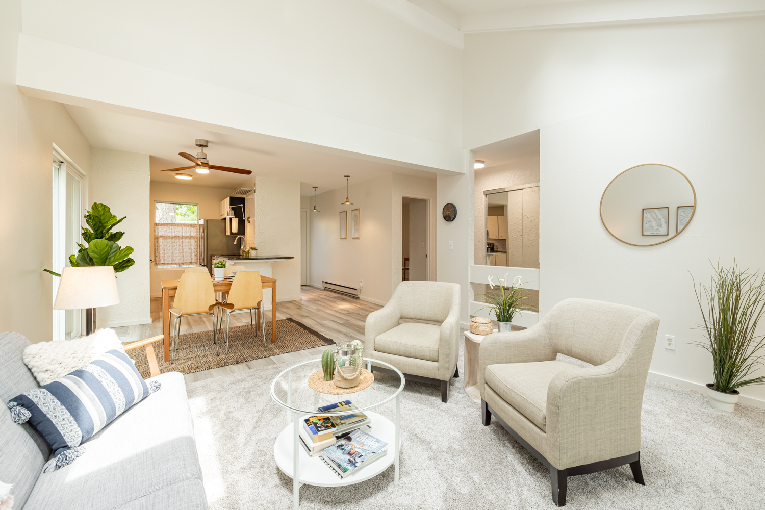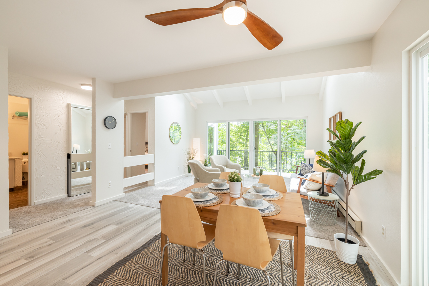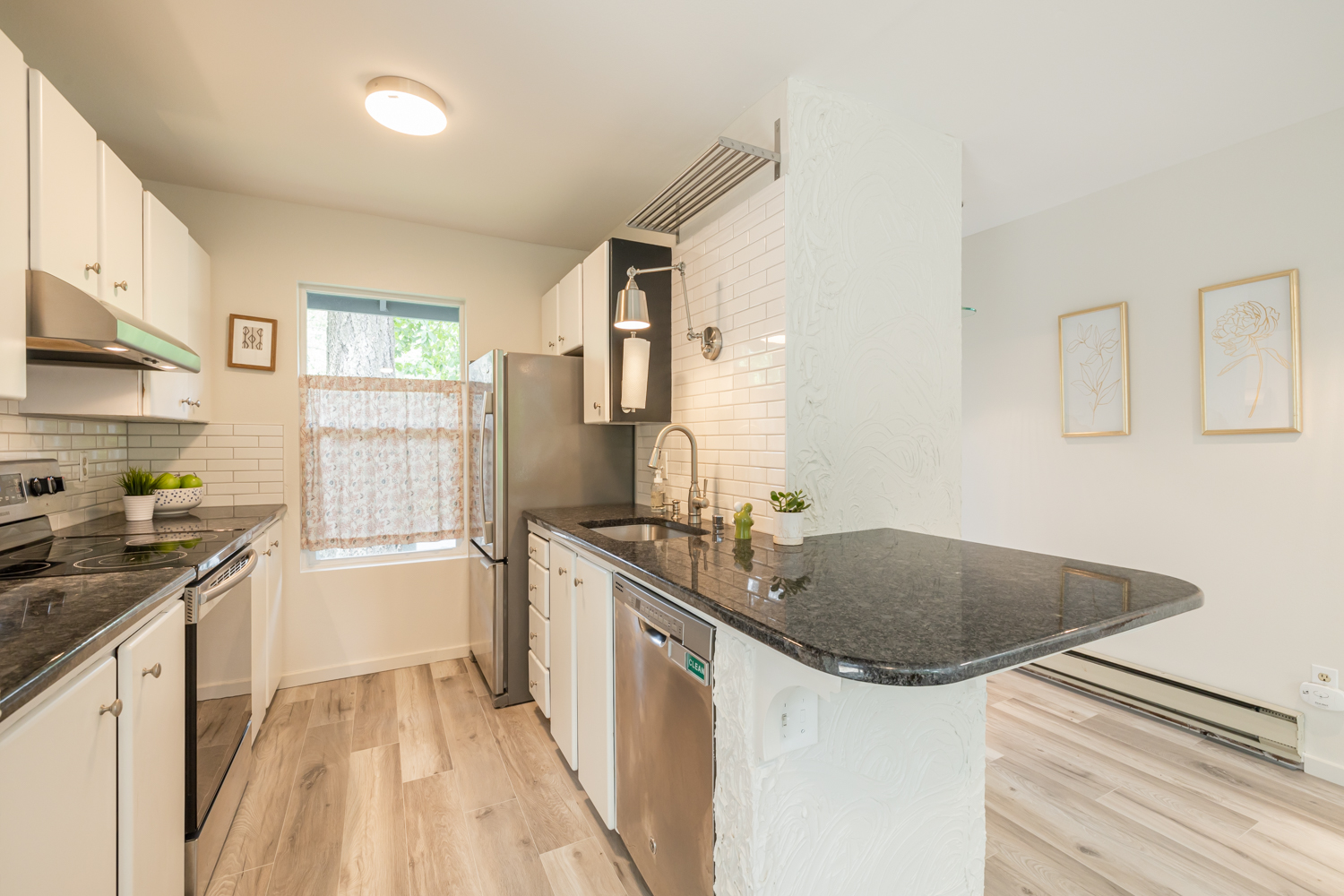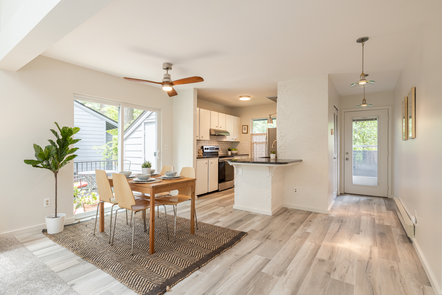 Discover a captivating upper floor condo nestled in the serene woods of SW Portland. This delightful residence offers an enchanting retreat with the perfect blend of modern comforts and rustic charm. Step inside to find a spacious living area adorned with vaulted ceilings, accentuating the sense of openness and airiness. “Natural light pours in through skylights (unique to any other home within this community), illuminating the space transformed by brand new paint, carpet, and flooring, providing a contemporary yet cozy ambiance.”